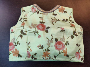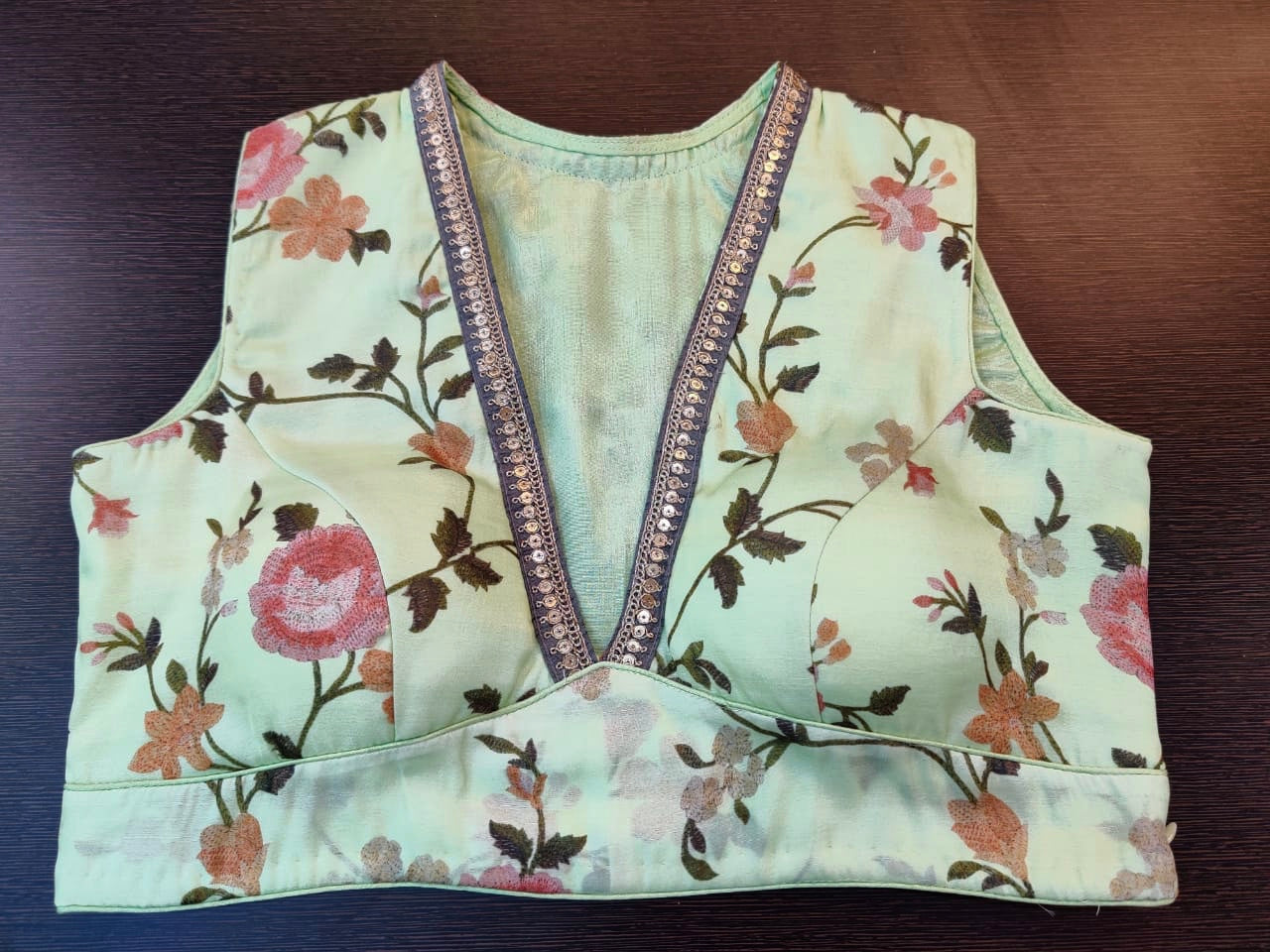 Attractive mint green floral saree blouse with embroidered neckline. Buy online from Pure Elegance