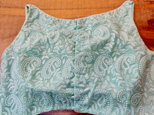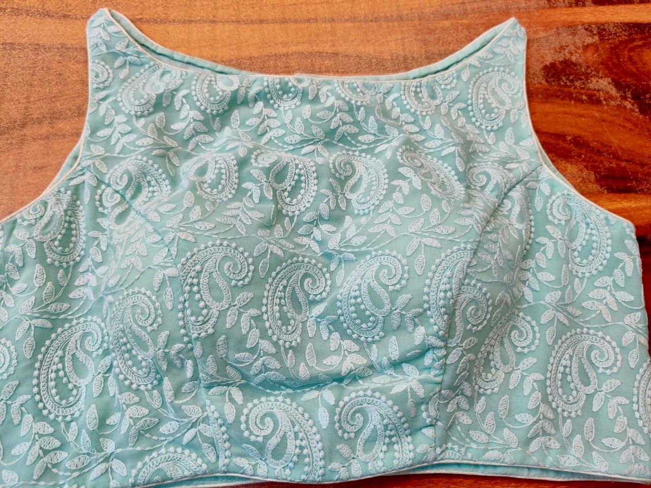 Gorgeous mint green Lucknowi embroidery designer sari blouse. Buy online from Pure Elegance