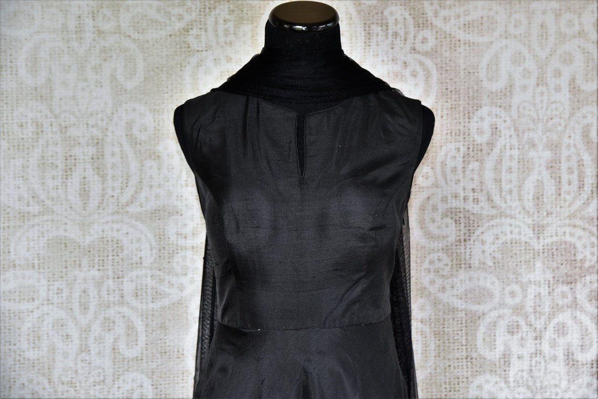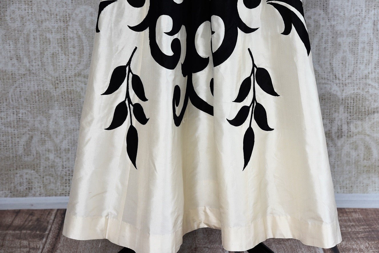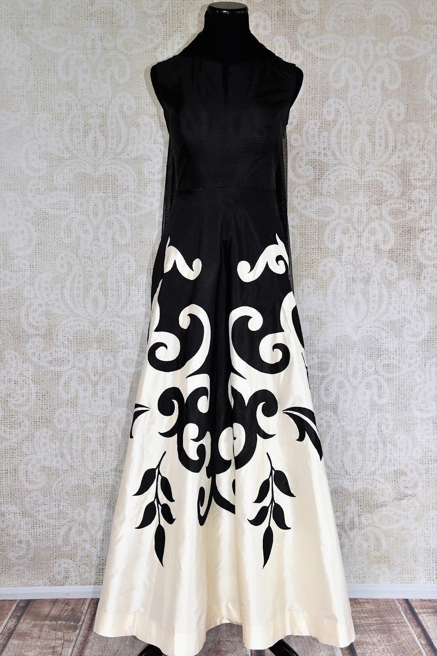 This stylish Monochrome Anarkali Suit is a classy choice for a cocktail party. It is understated and minimal which makes it sophisticated. The applique work on the suit creates an interesting effect. It comes with a black dupatta. If you are looking for an Indo-western outfit this is the right pick for you!