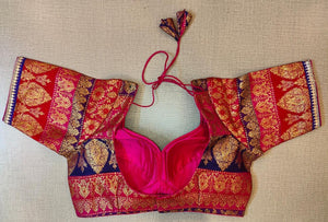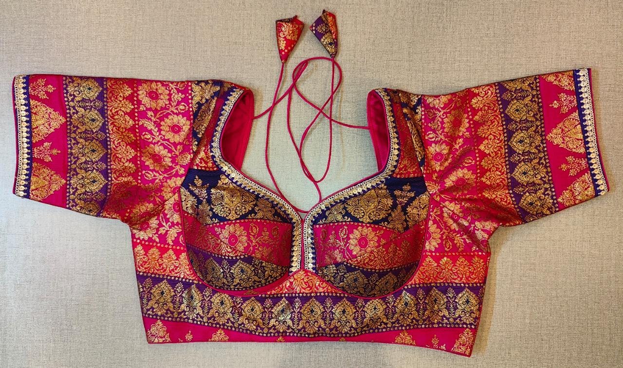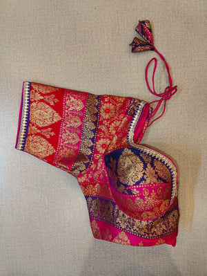 Beautiful multicolor Banarasi saree blouse with sequin lace. Buy designer blouse in USA from Pure Elegance.