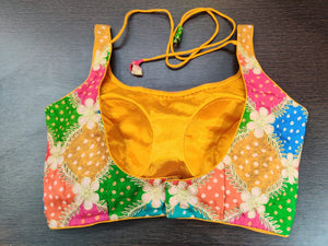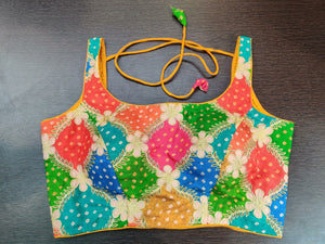 Stunning multicolor printed embroidered sleeveless sari blouse . Buy designer blouse in USA from Pure Elegance.
