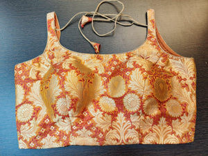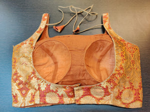 Gorgeous mustard and golden Banarasi sleeveless saree blouse. Shop designer saree blouse online in USA from Pure Elegance.