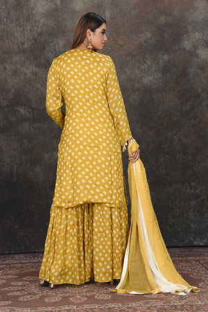 503251 Mustard Bandhej Gharara Suit with Embroidered Patch