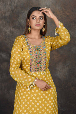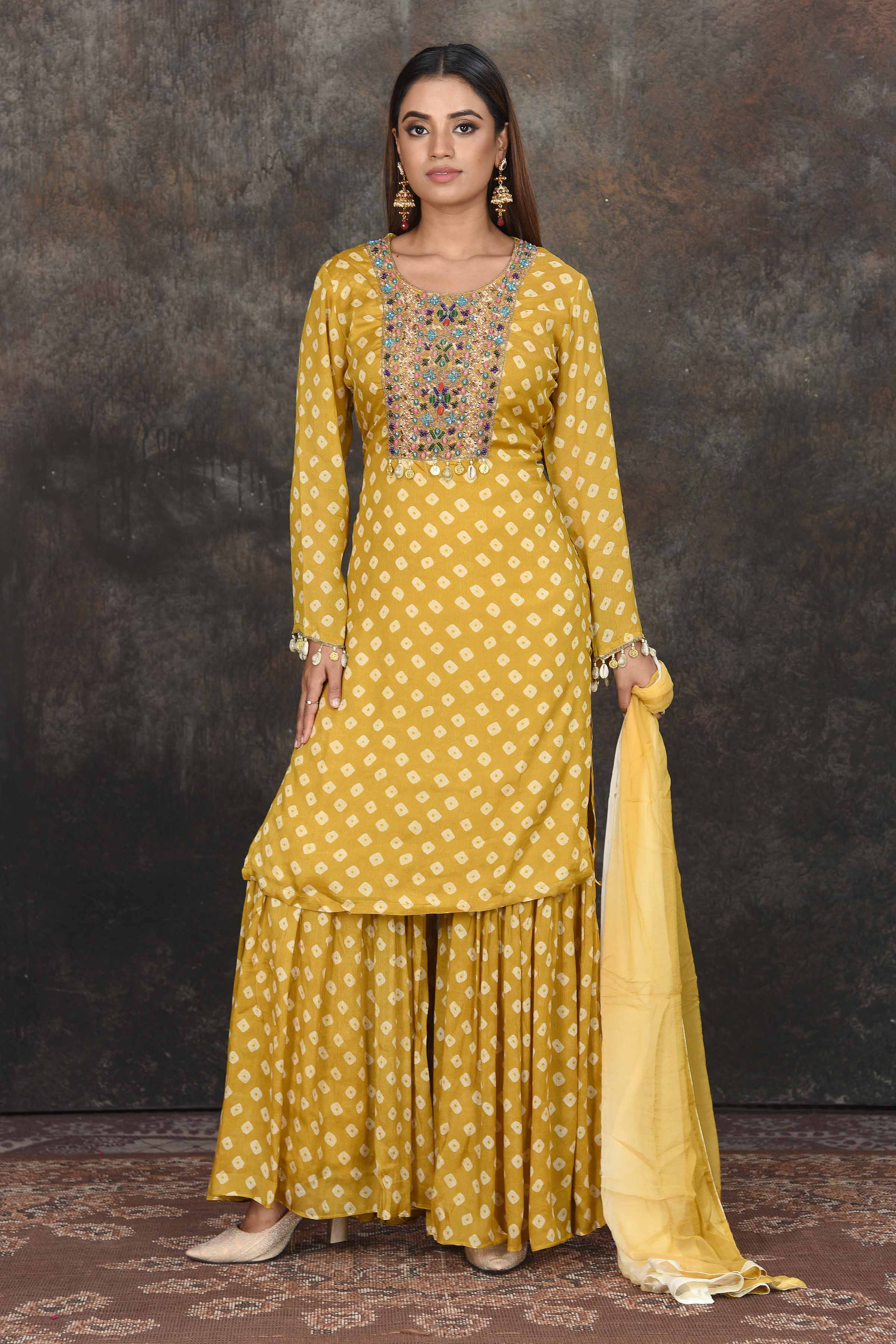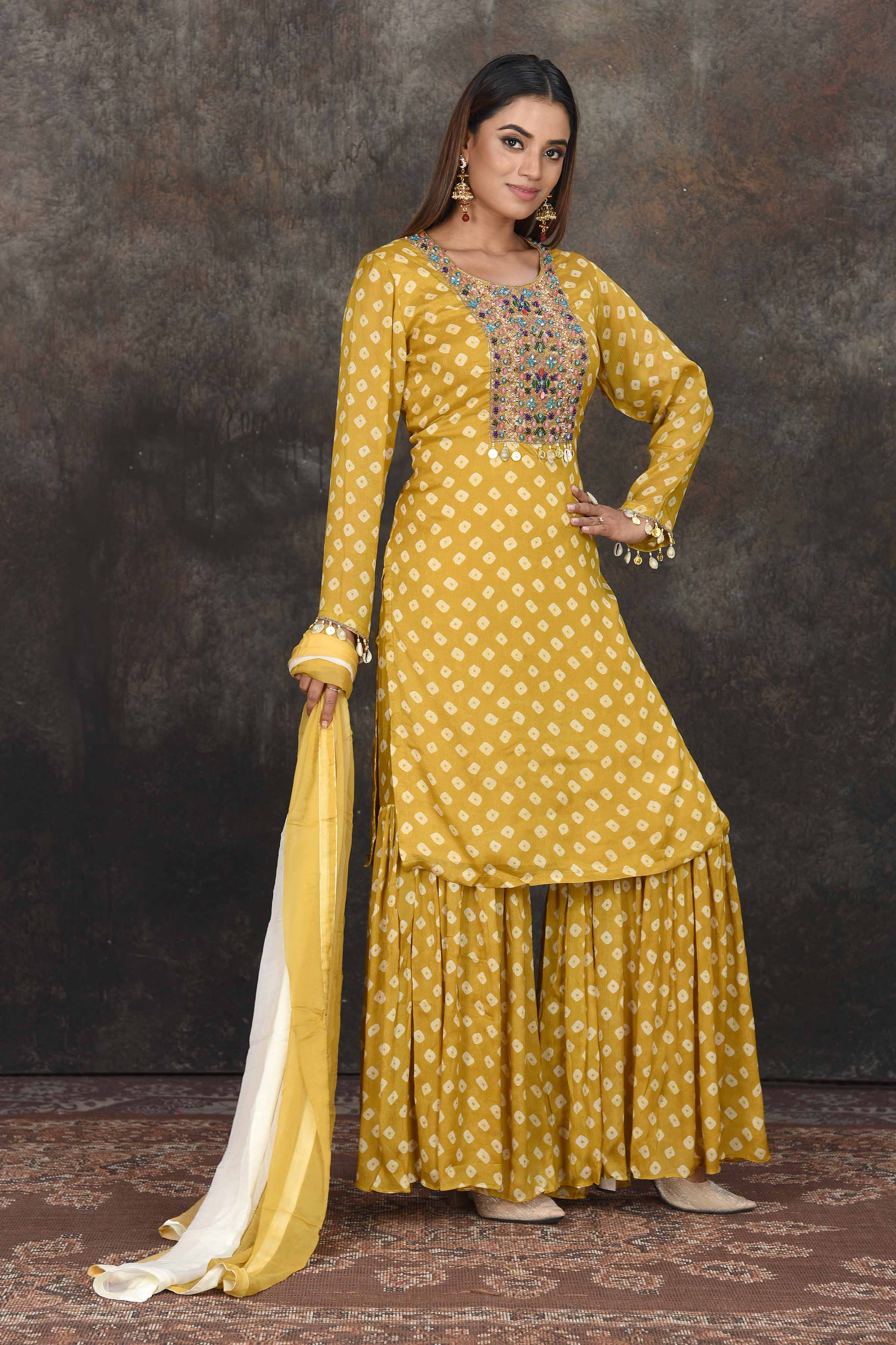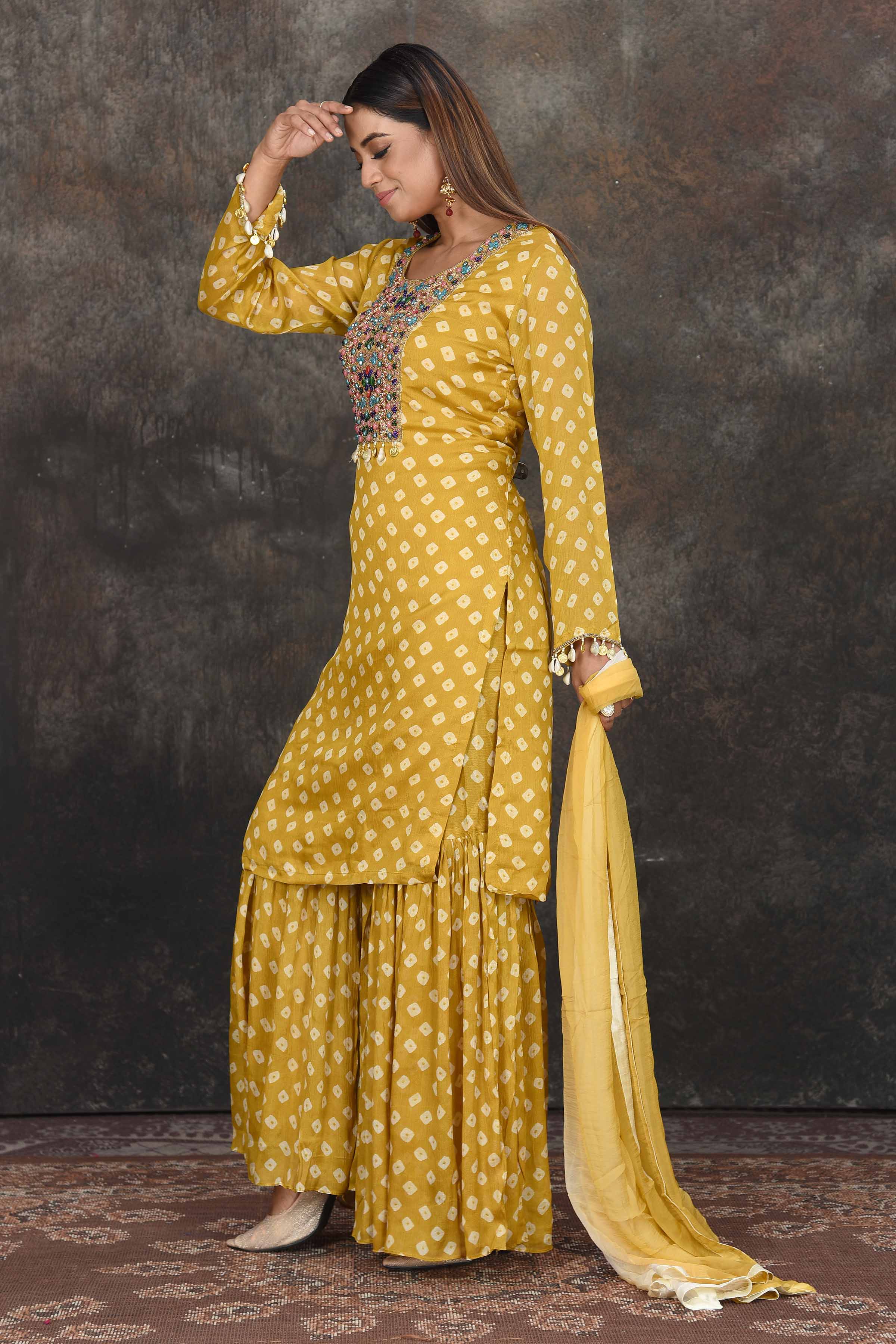 Beautiful mustard bandhej gharara suit with embroidered patch is a perfect ensemble for festive occasions. It comes with a matching dupatta. Shop online in USA from Pure Elegance.