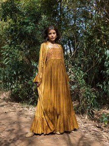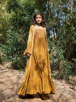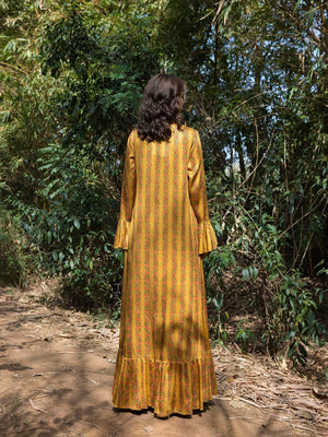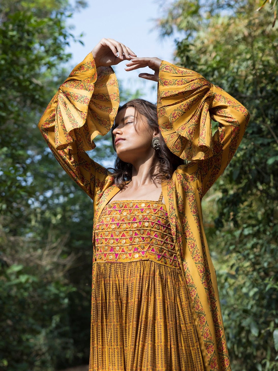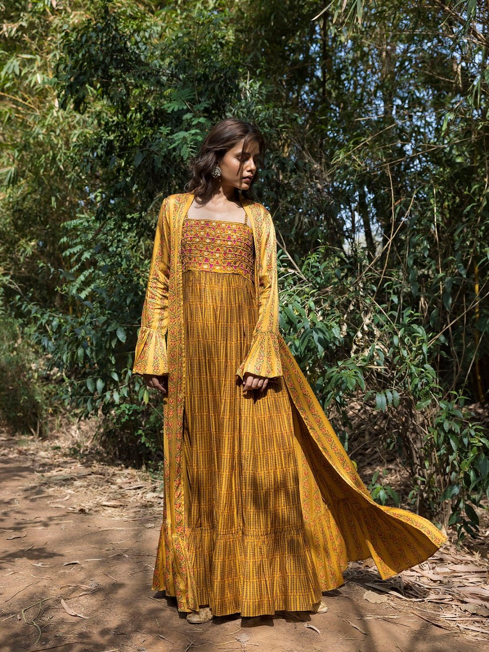 Beautiful and contemporary mustard printed soft cotton maxi dress with cape jacket. Shop online from Pure Elegance.