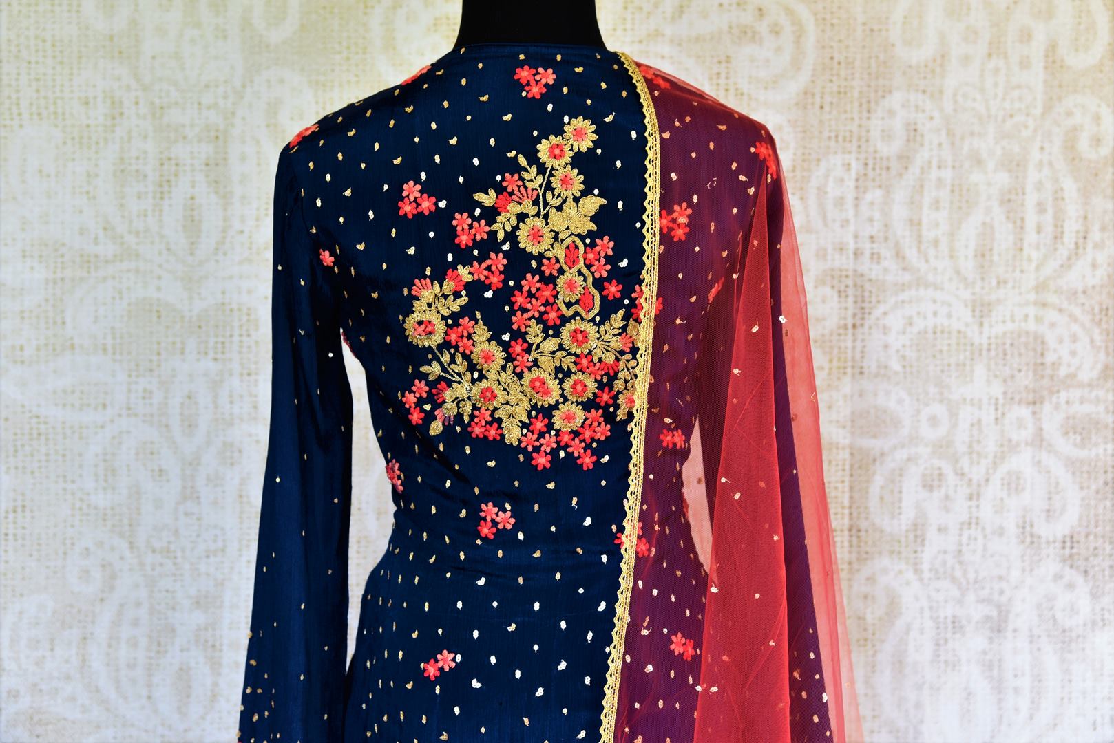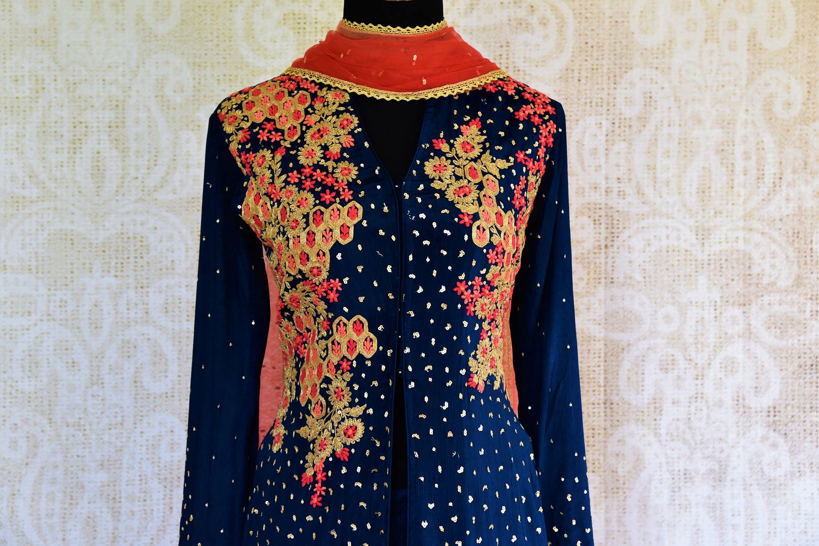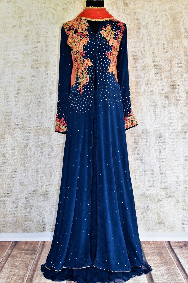 Keep it stylish and traditional in this designer embroidered Georgette kurta and skirt. It has stunning silhouette which gives it an appeal of floor length Anarkali and the beautiful floral embroidery brings galore of dazzling charm to the outfit. It comes with an orange dupatta. Buy online from Pure Elegance or visit our store in USA!