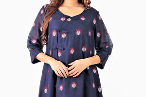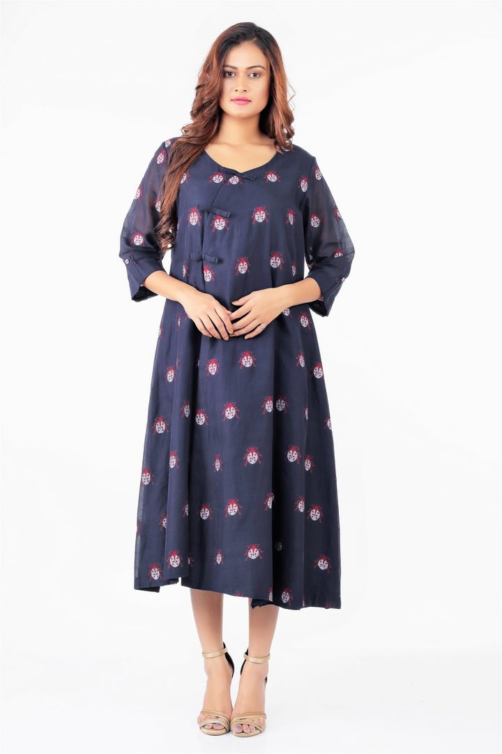 Alluring navy blue Jamdani silk dress with woven lady bug motifs by Sayantan Sarkar for an easy breezy feminine style. Shop online from Pure Elegance or visit our store in USA.