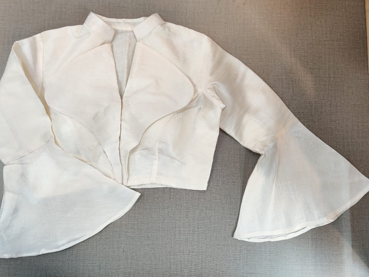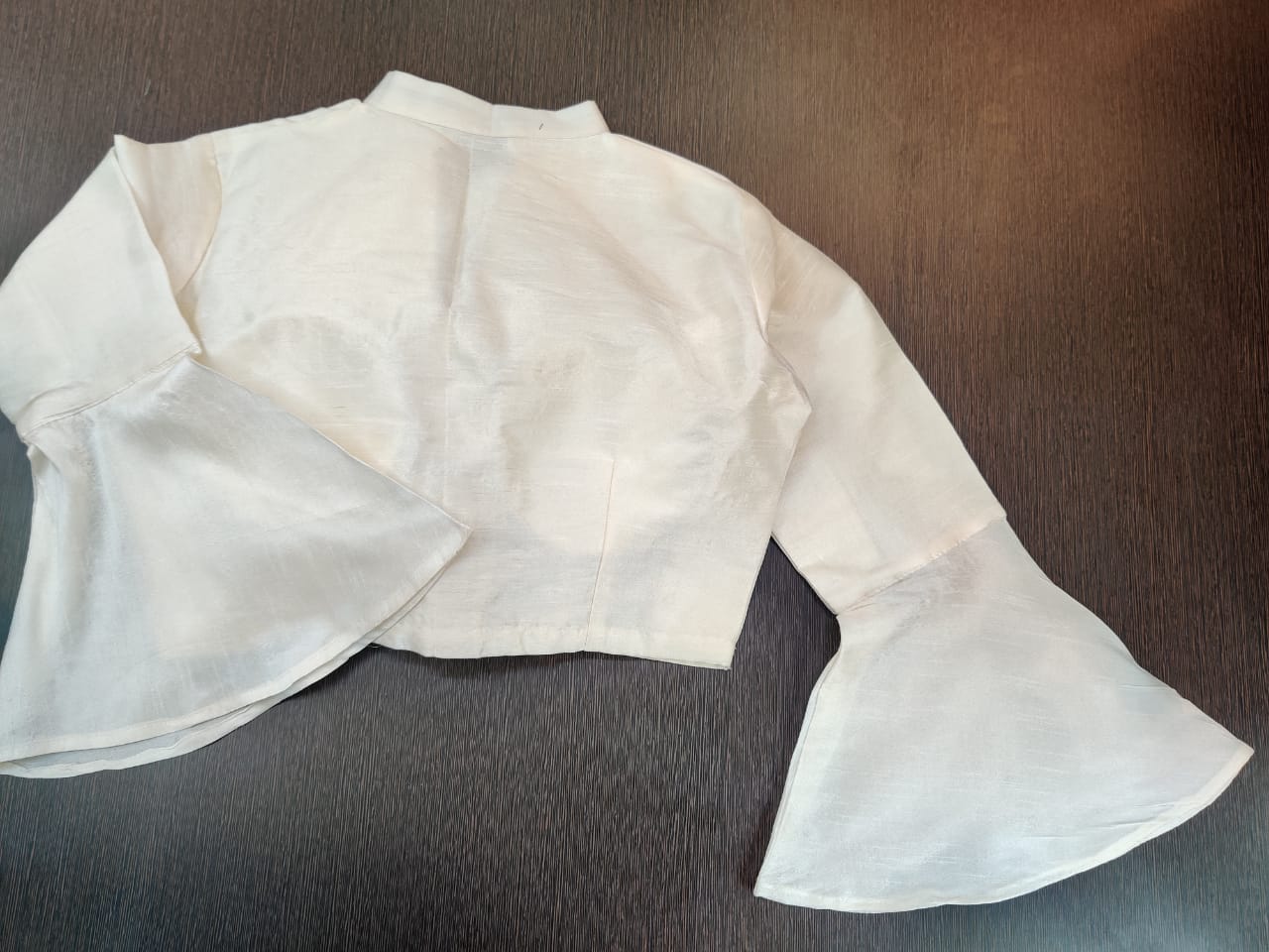 Stunning off-white designer saree blouse with bell sleeves. Buy designer blouse in USA from Pure Elegance.