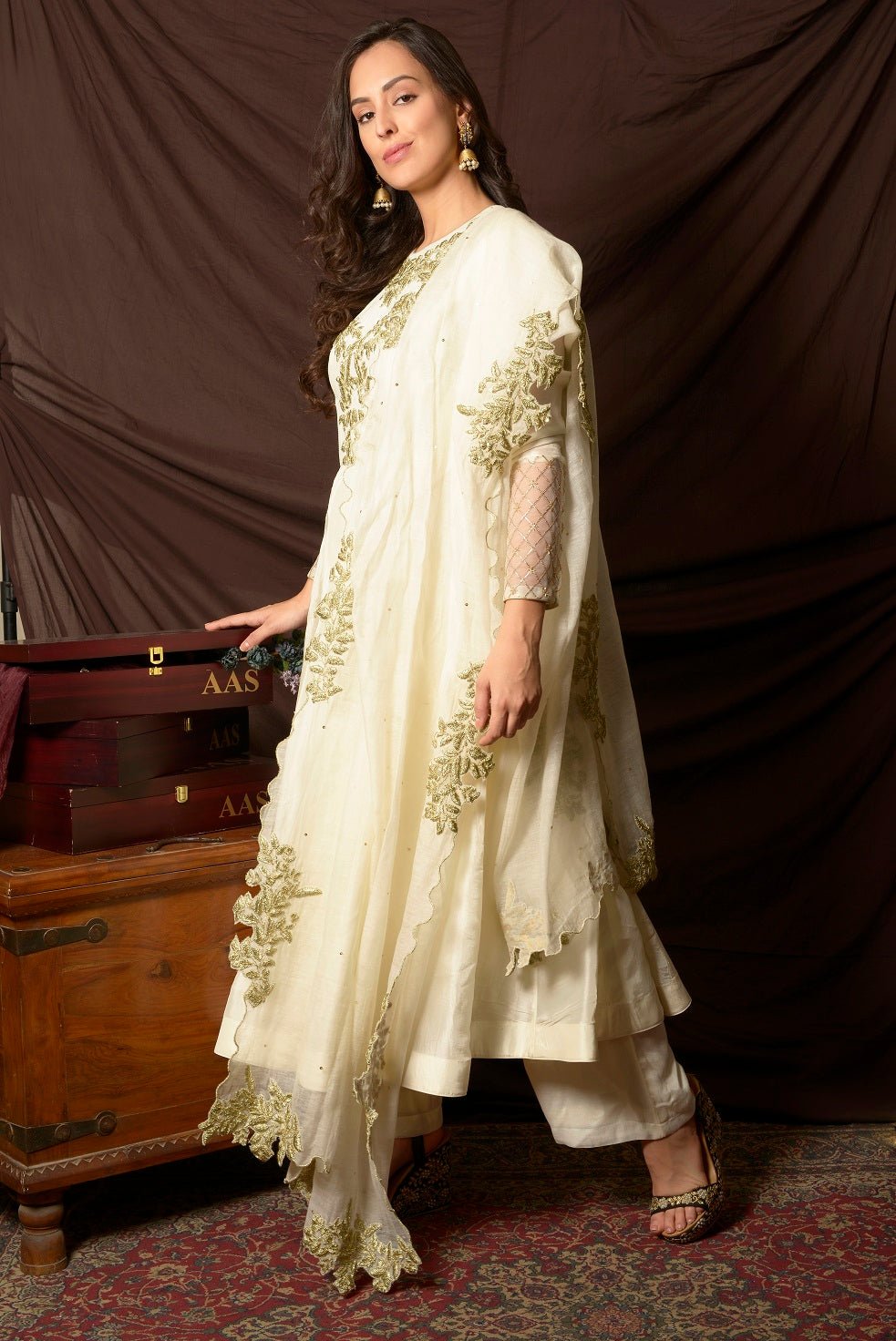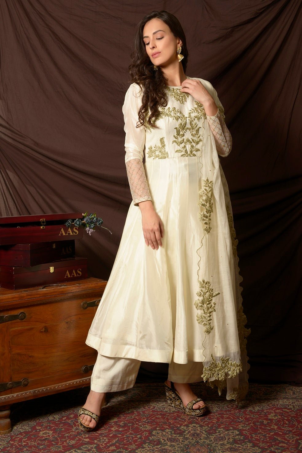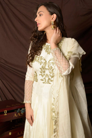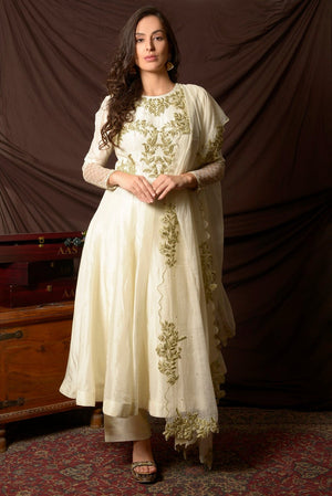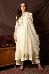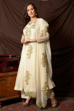 Elegant off-white embroidered Uppada silk suit with palazzo and matching dupatta! The suit is perfect for occasions like sangeet and festivals. Shop designer Indian suits in USA from Pure Elegance.