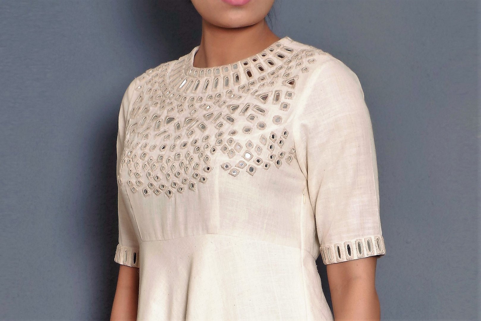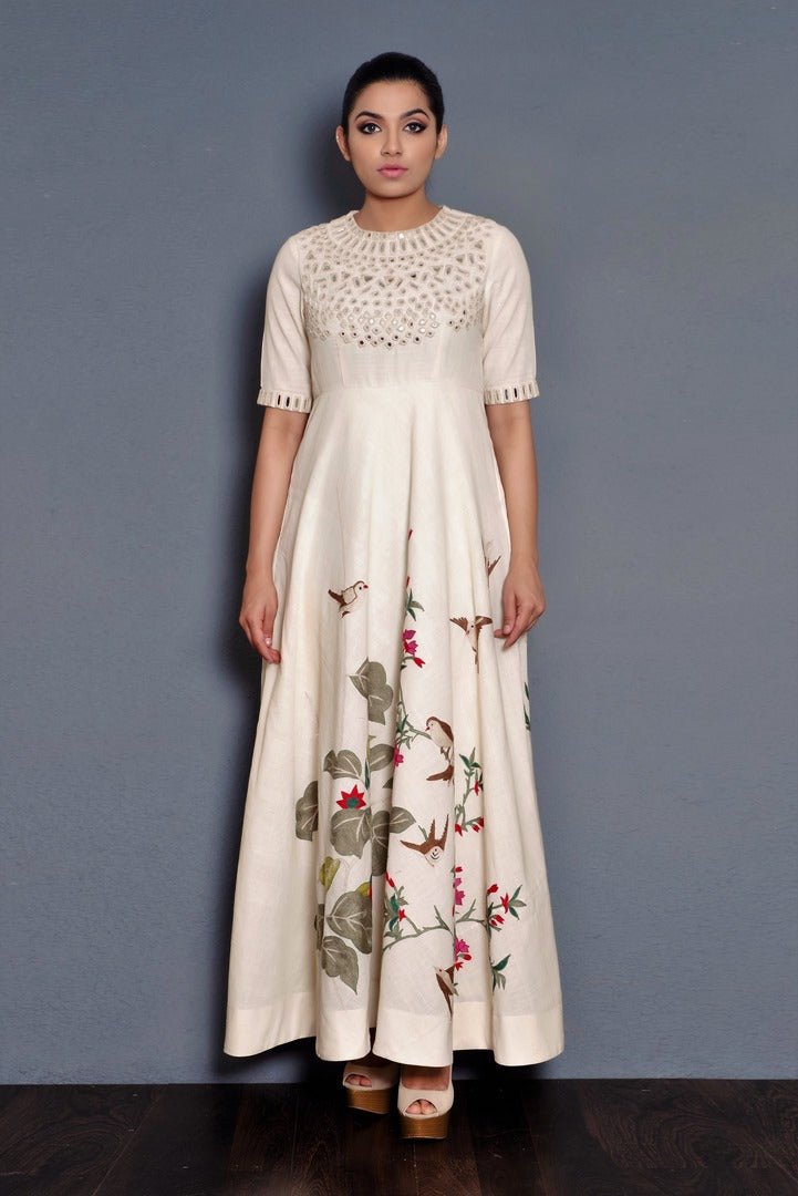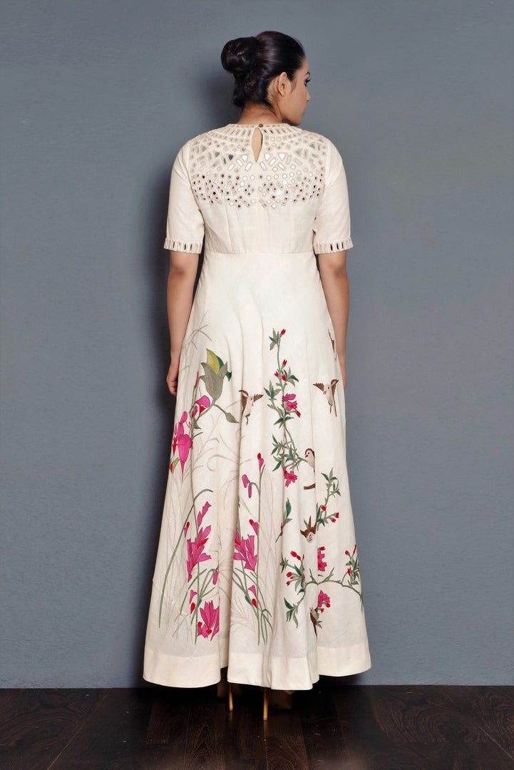 Garner compliments in this off-white full-length dress by Purvi Doshi. The dress is crafted with mirror work and parsi embroidery which makes it perfect for special occasions. Shop online at Pure Elegance or visit our store in USA!