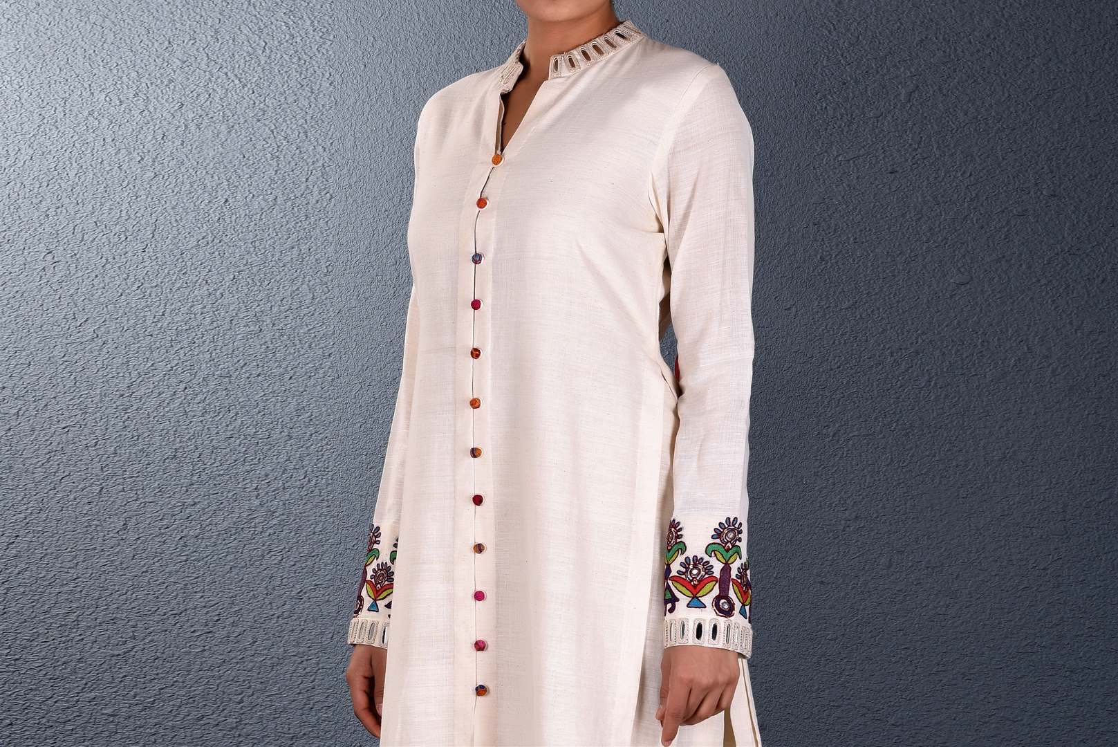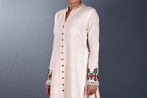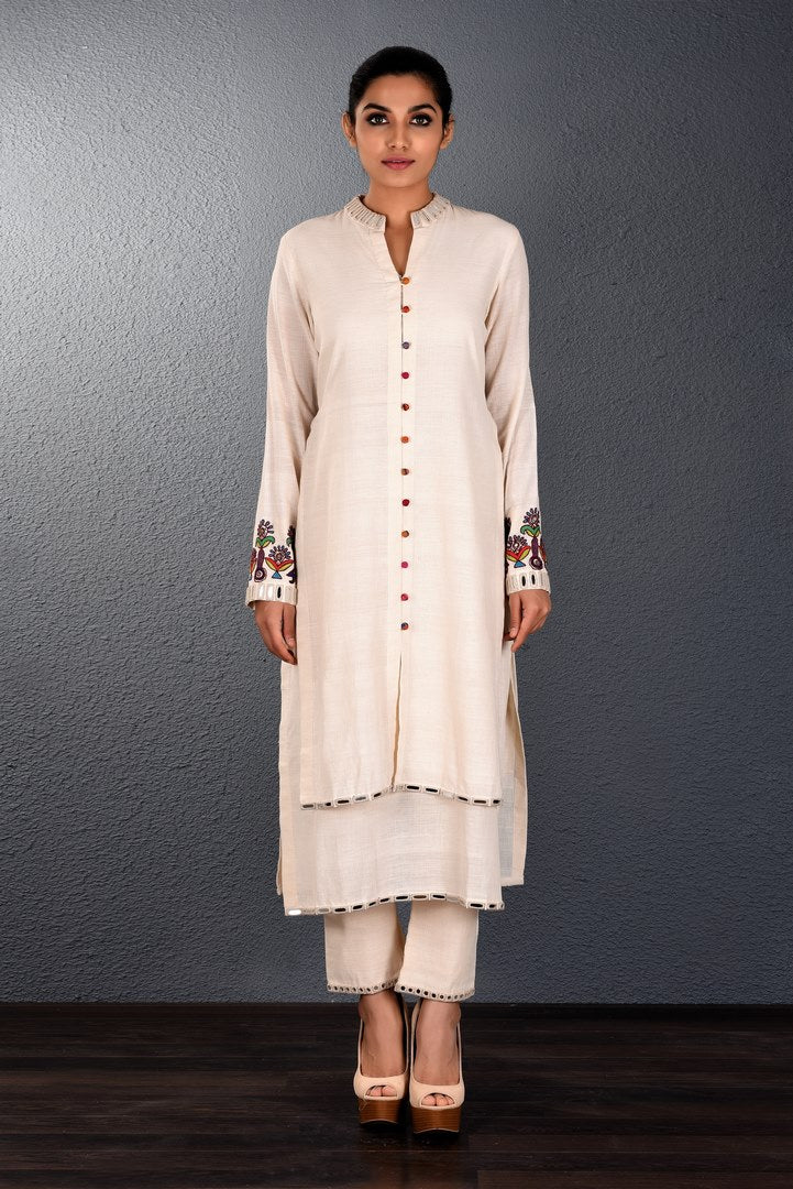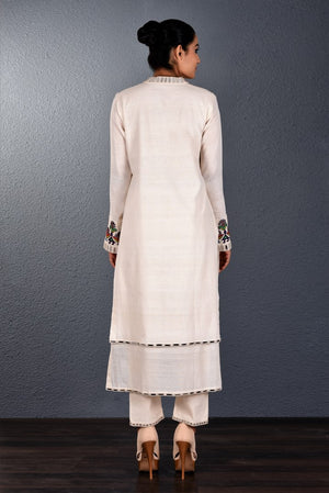 Alluring off-white hand embroidered double layer kurta with slim pants by Purvi Doshi for special occasions. The kurta is crafted with hand embroidery and mirror work. Shop online at Pure Elegance or visit our store in USA!