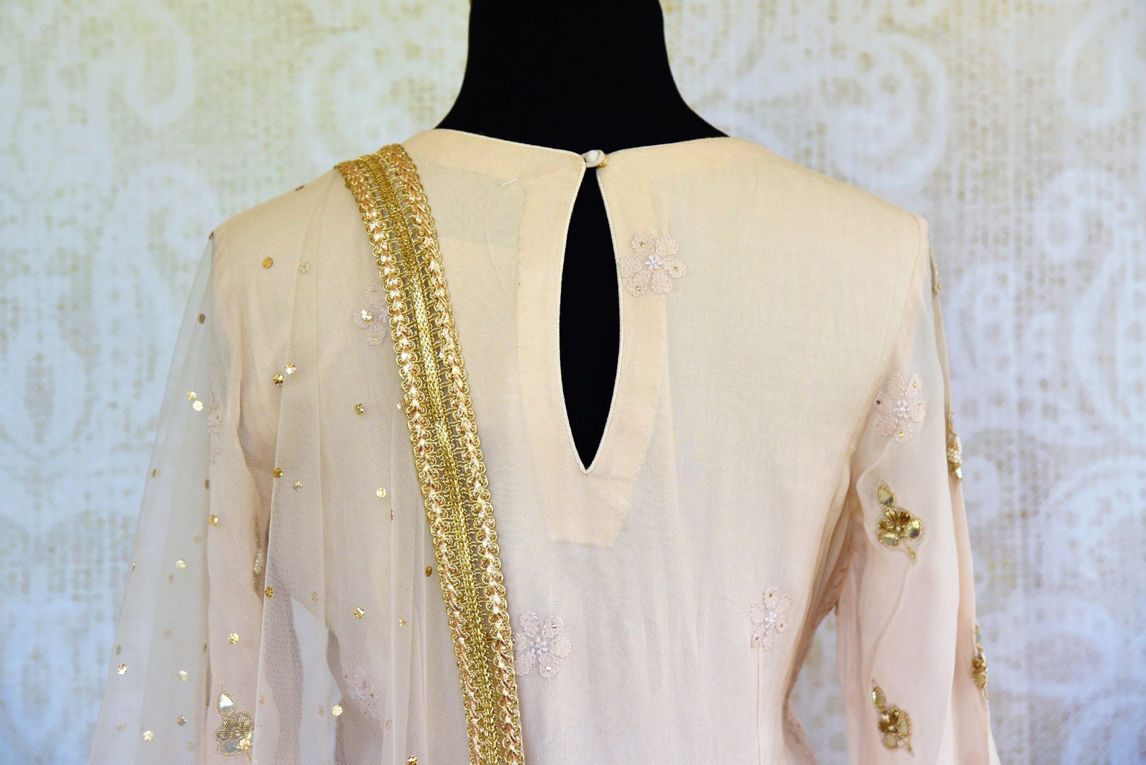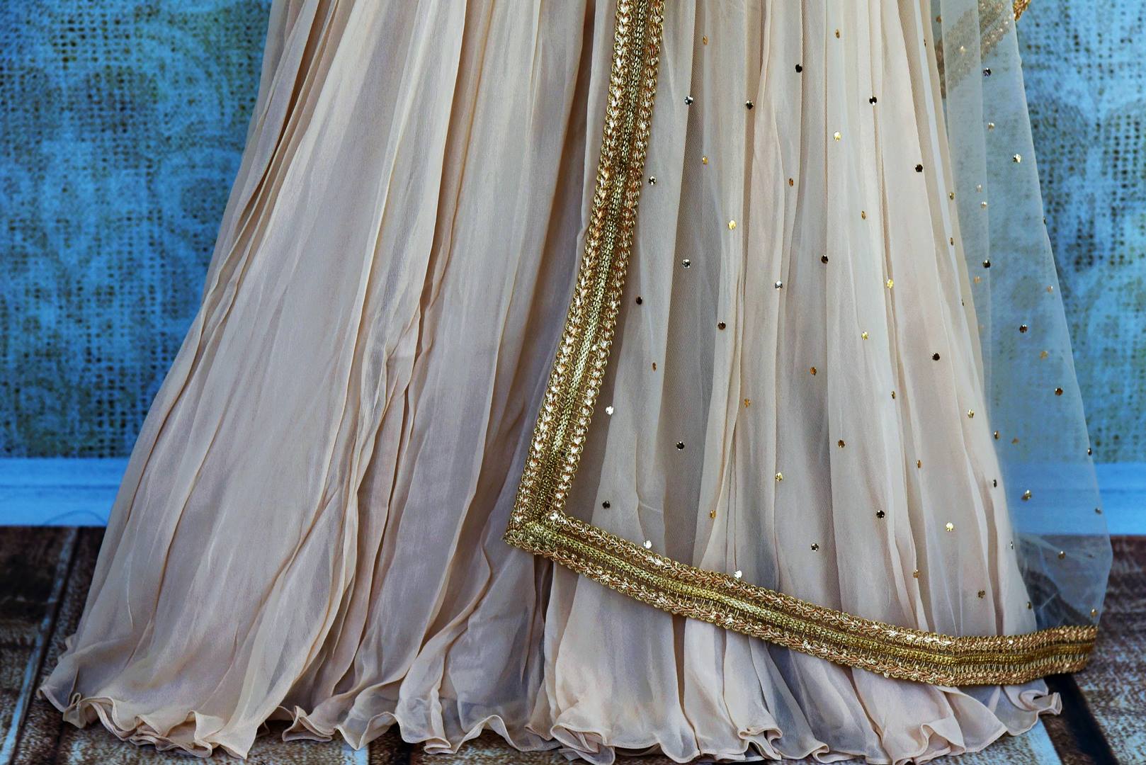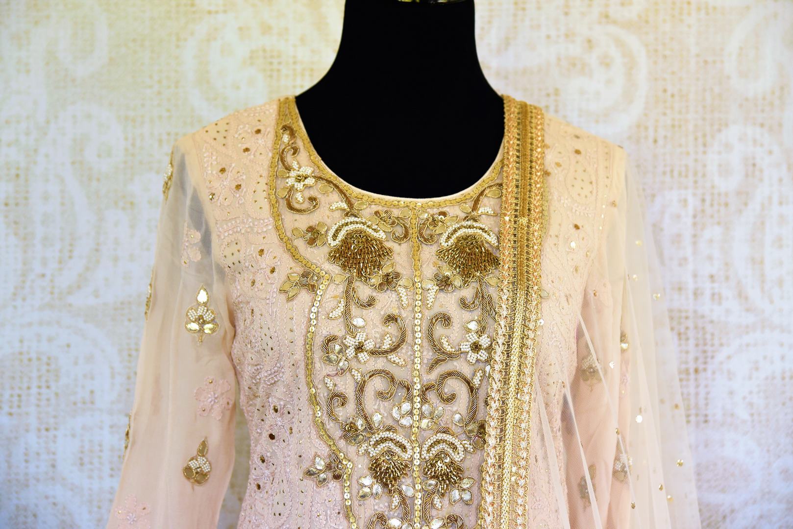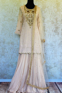 Beautiful off-white embroidered Lucknowi kurta with skirt is a perfect choice for parties, festivities or daytime weddings. It is perfect to channelize your feminine look with aplomb. Delicate and fine Lucknowi work makes this outfit one of a kind. It comes with an equally stunning dupatta. Buy online from Pure Elegance or visit our store in USA!