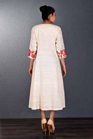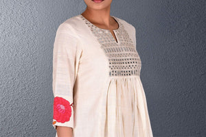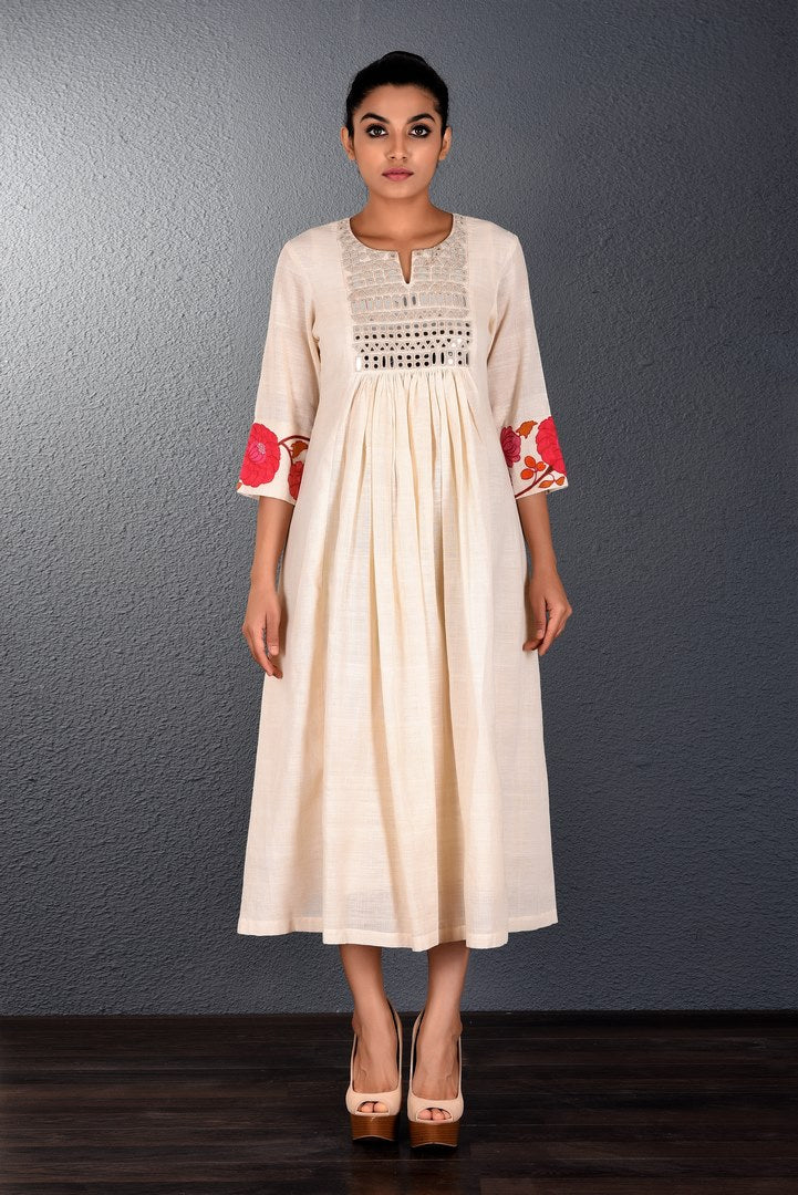 Stunning off-white mirror embroidery gathered dress by Purvi Doshi. Shop online at Pure Elegance or visit our store in USA!