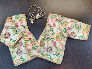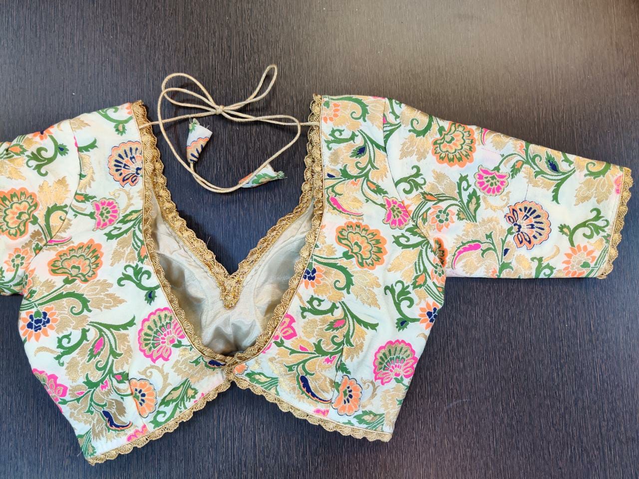 Stylish off-white zari minakari saree blouse with golden lace. Shop designer saree blouse online in USA from Pure Elegance.