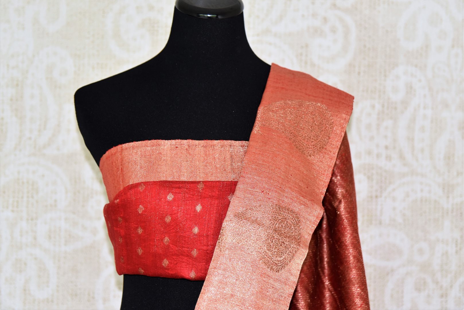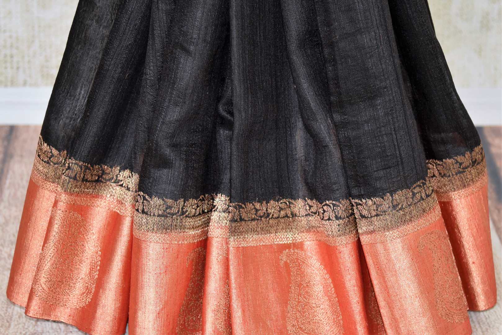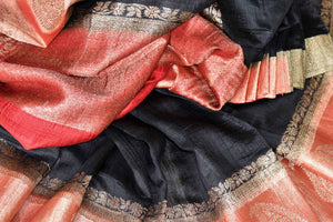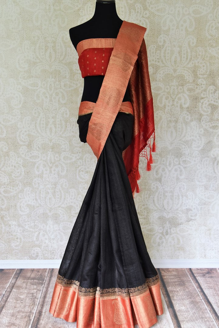 Brighten up your ethnic look in this classic black tussar Banarasi saree with a red zari border and pallu at parties, receptions or weddings! The saree is highlighted with zari work on the border and pallu which includes a leafy creeper and paisley buta. It comes with red color blouse piece. Shop online at Pure Elegance or visit our store in USA!