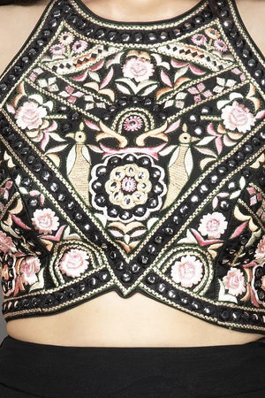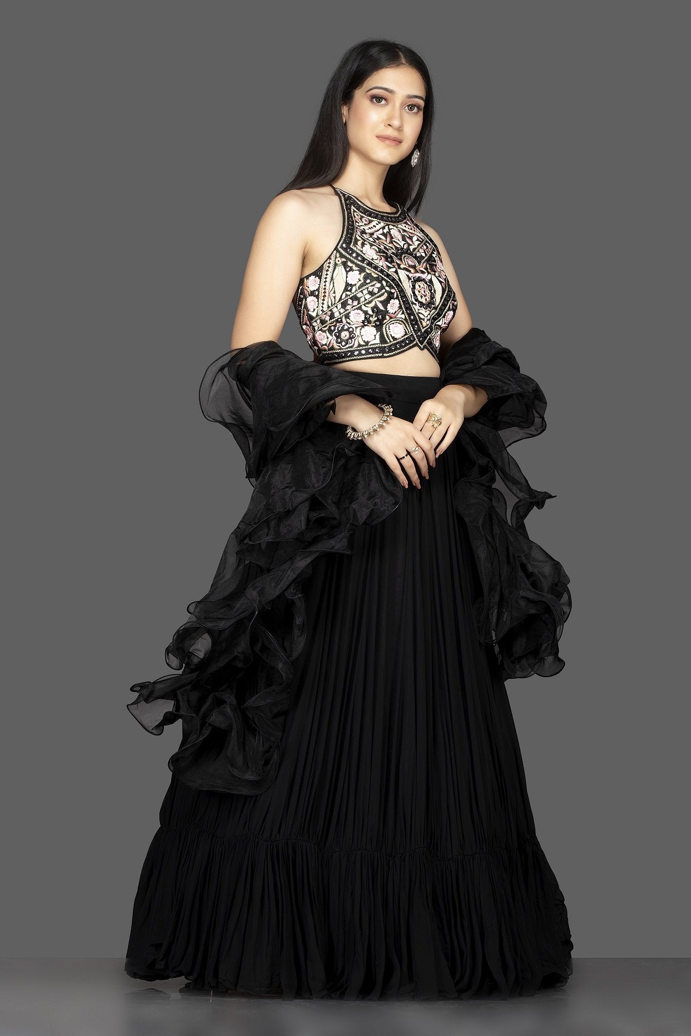 Keep it simple yet striking with this oh-so-glamorous black georgette lehenga on weddings. The lehenga comes with a ruffle dupatta and beautiful embroidered halter neck blouse. Buy exquisite designer Indian dresses in USA from Pure Elegance.