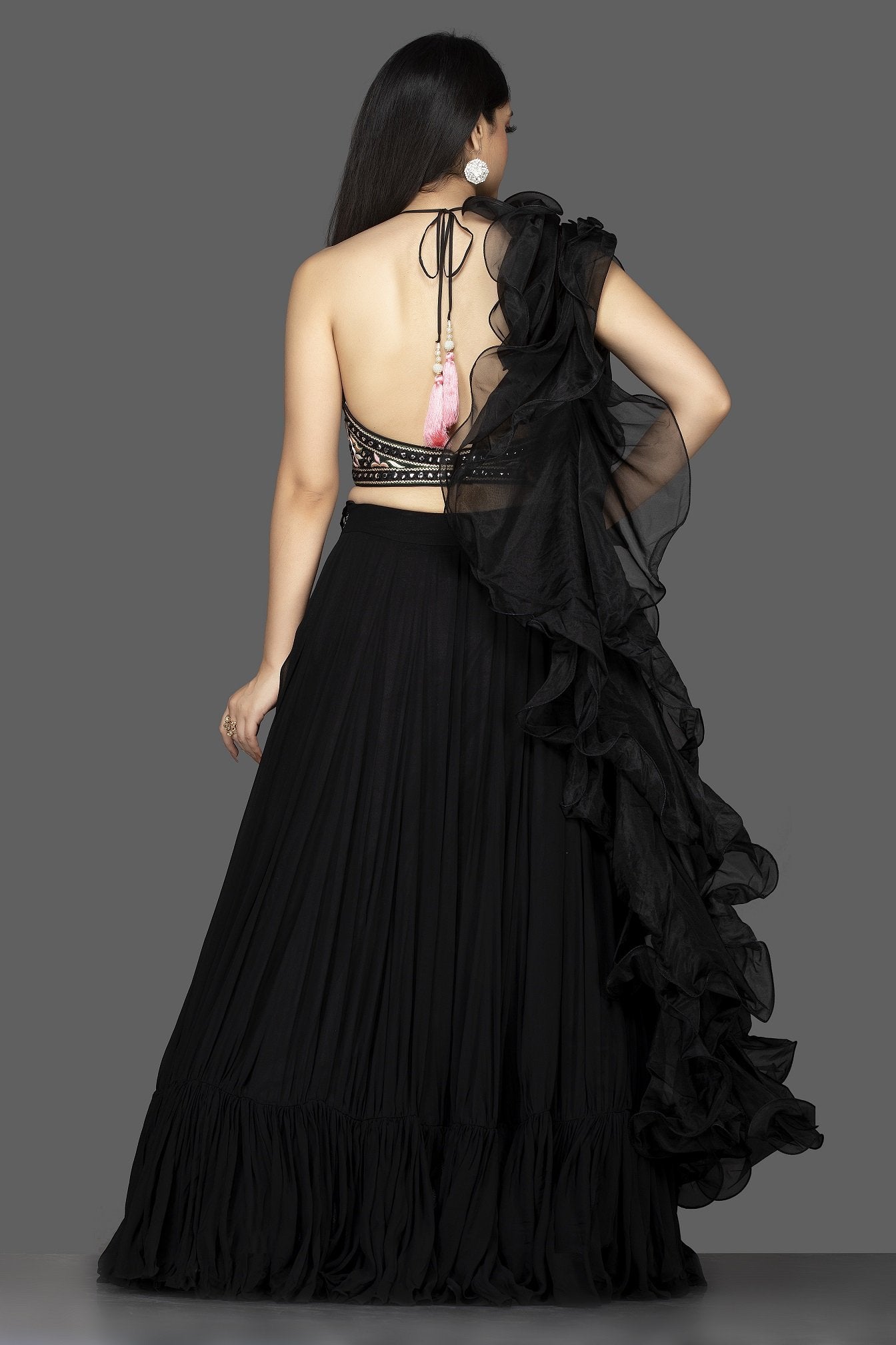 300457 Black Georgette Lehenga with Ruffle Dupatta and Embroidered Blouse