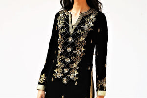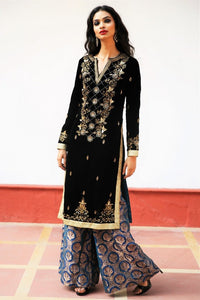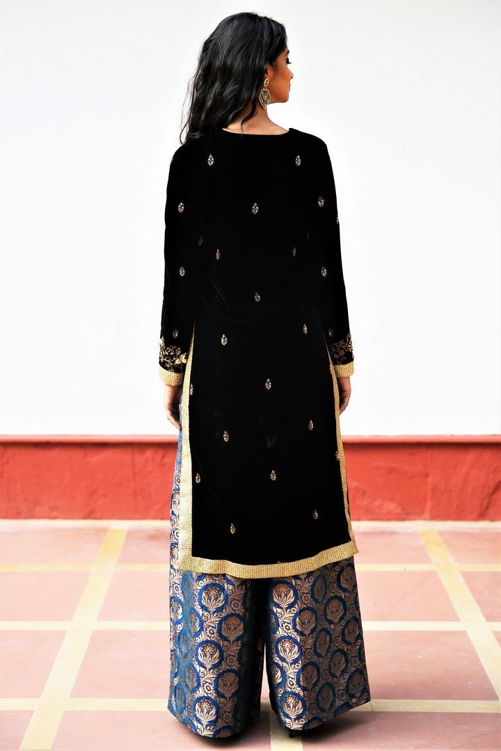 Add an Afghani vibe to your style with this black silk velvet embroidered yoke kurta! It is paired with blue zari brocade palazzo. Shop online at Pure Elegance or visit our store in USA.
