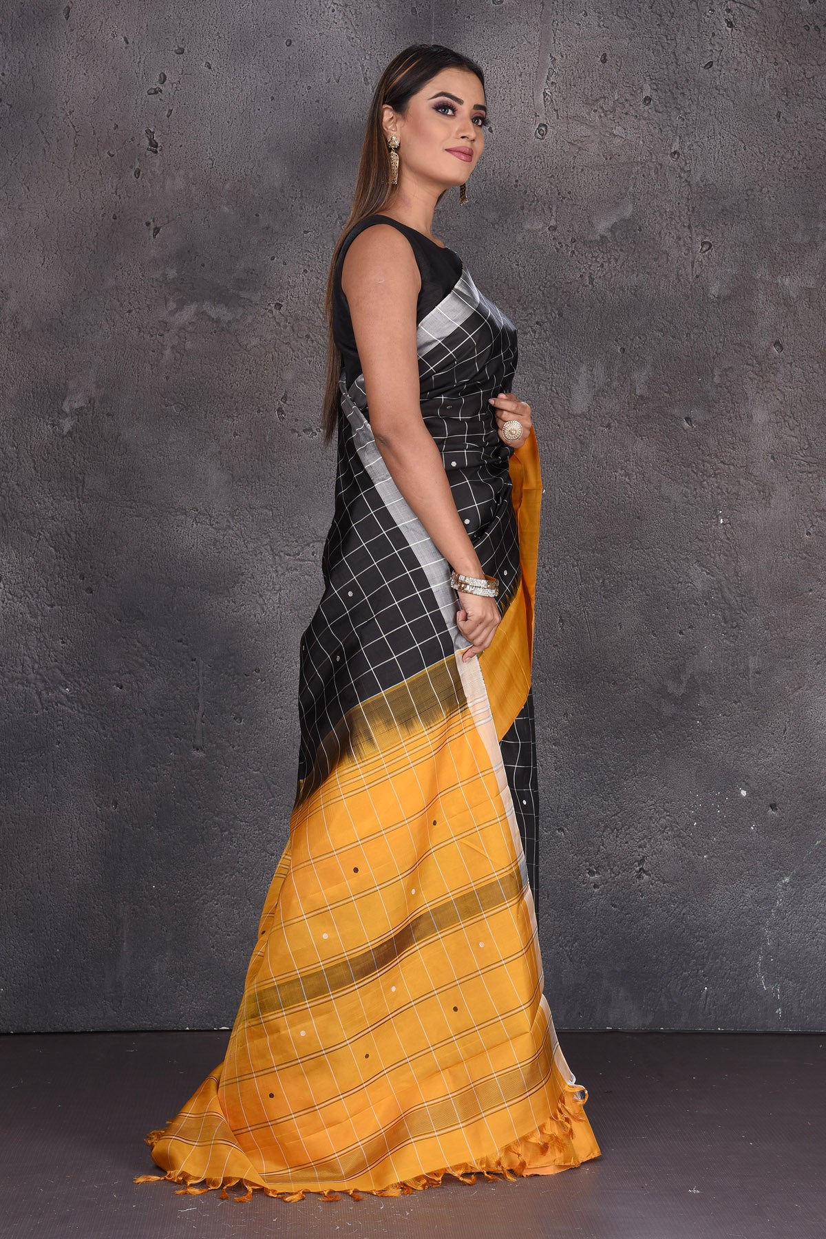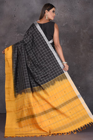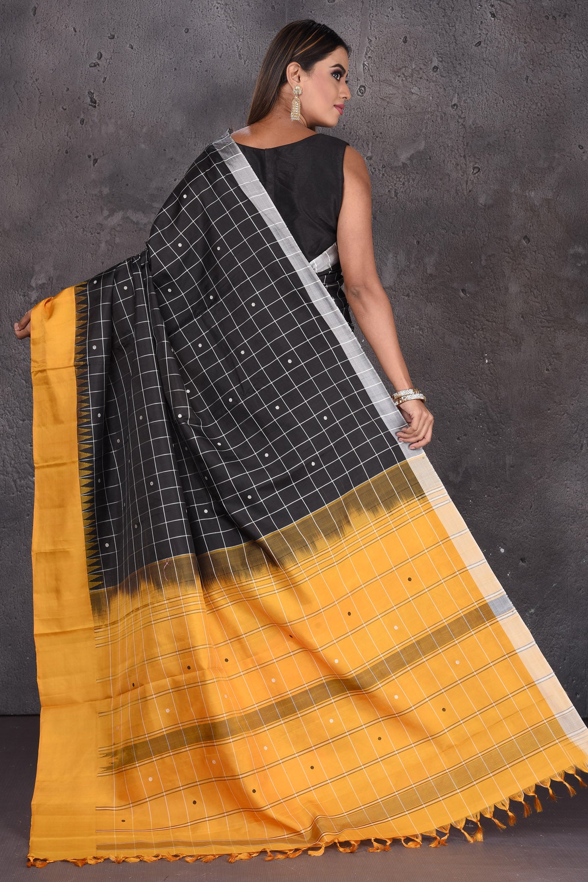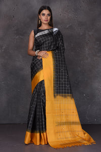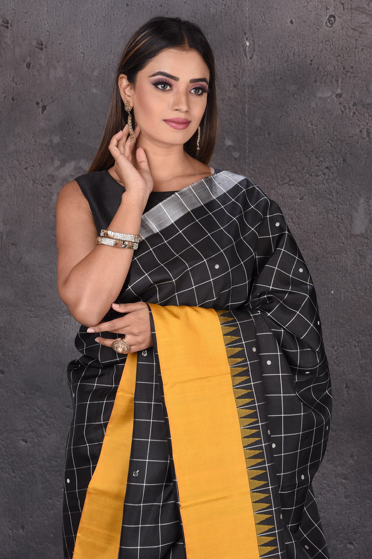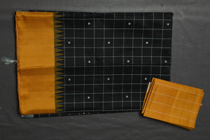 Beautiful black zari check Kanjeevaram silk sari with mustard zari border. It comes with a matching blouse piece. Shop Kanchipuram silk sarees in USA from Pure Elegance.