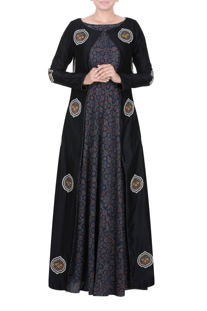 A unique and Indowestern twist made to convert an ordinary Anarkali into a special one. It is a blue ajrakh print chanderi anarkali paired with midnight blue cape. The cape is crafted with ajrakh appliques. Shop online at Pure Elegance or visit our store in USA!