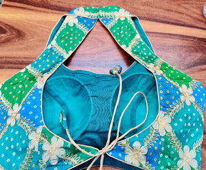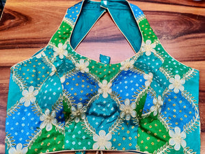 Beautiful blue and green embroidered Bandhej halter neck saree blouse. Shop designer saree blouse online in USA from Pure Elegance.