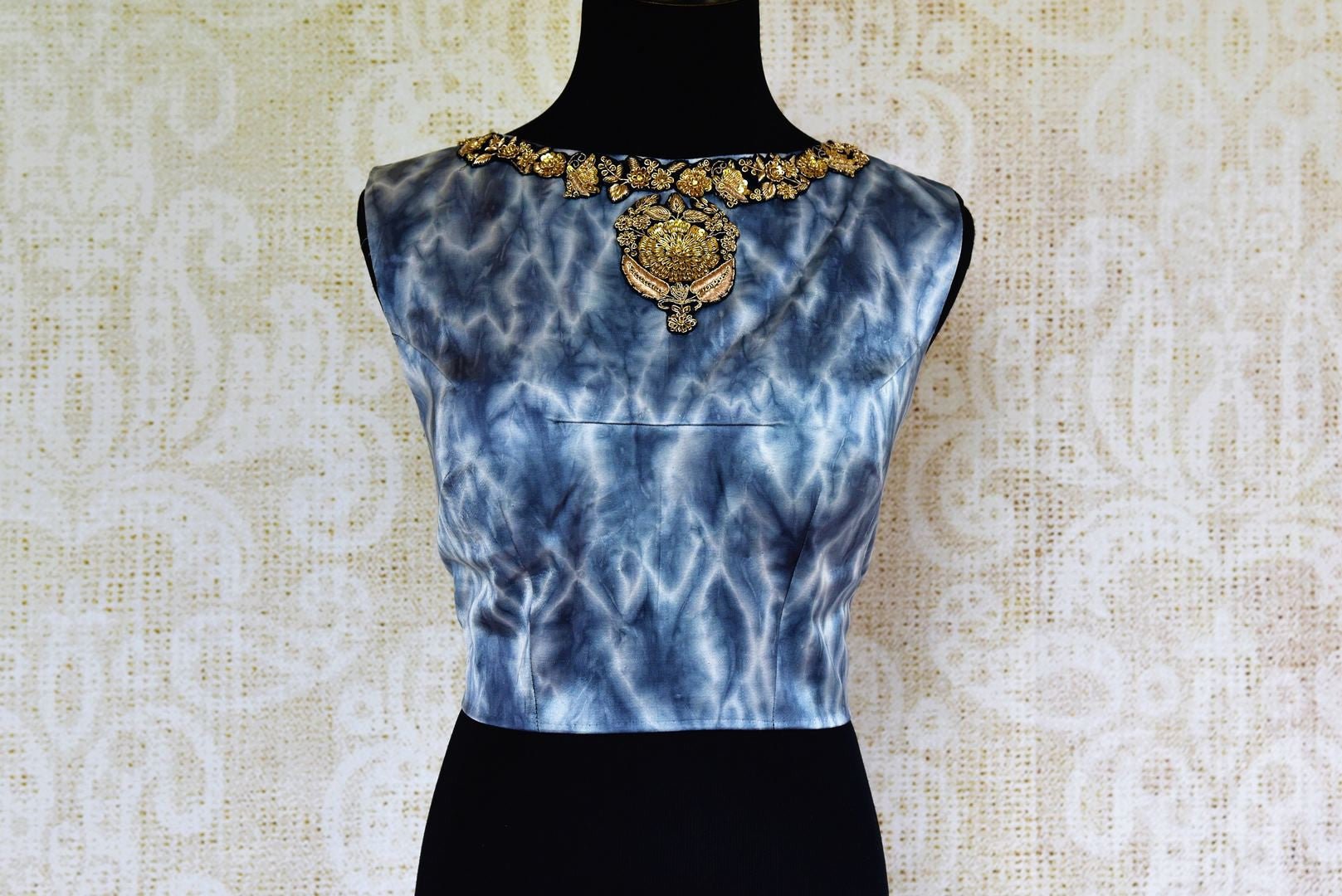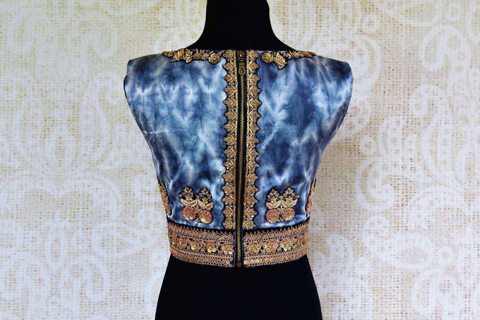 Keep your Chanderi sarees classy by pairing with this elegant blue readymade sleeveless blouse! The batik print of the blouse is perfectly adorned with embroidery making it an impeccable choice for your simple sarees. While the front has minimal embroidery the back is elaborate with heavy work. Grab it online from Pure Elegance or visit our store in USA!