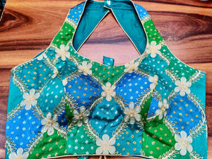Ethnic modern blue and green Bandhej silk embroidered designer saree blouse with halter neck. Buy online from Pure Elegance.