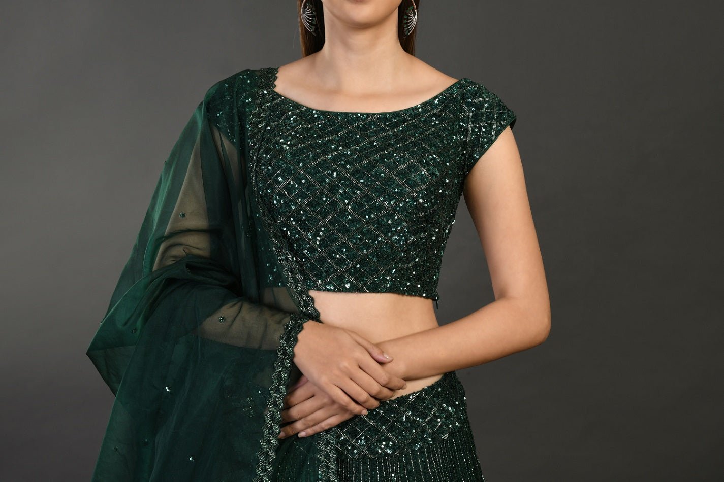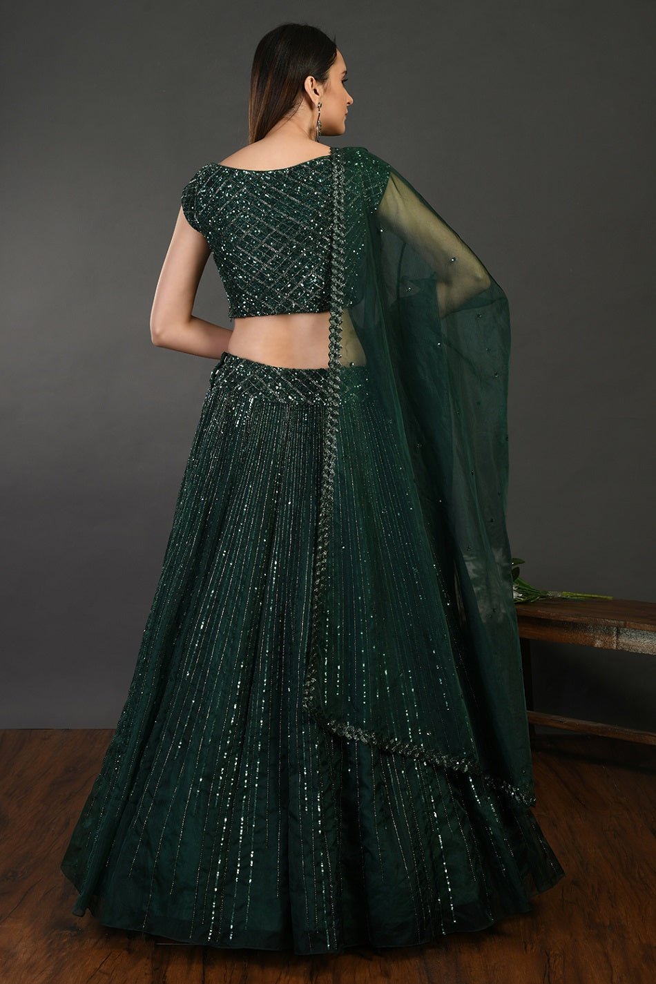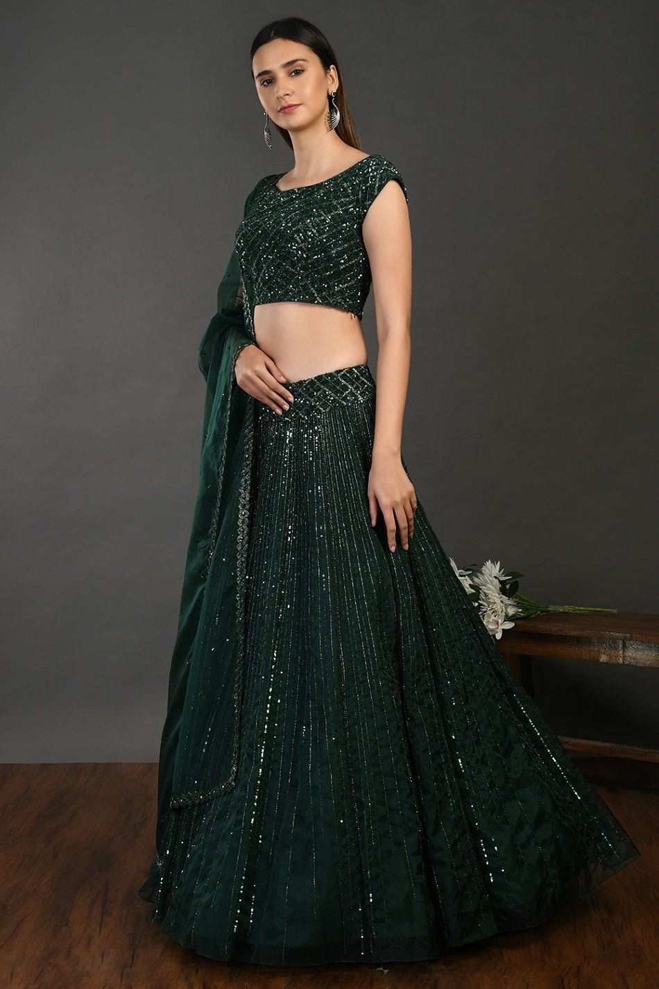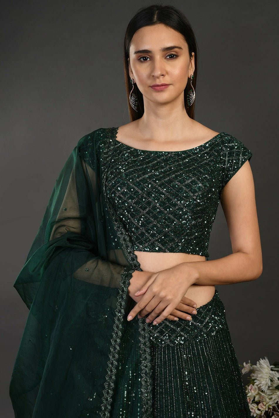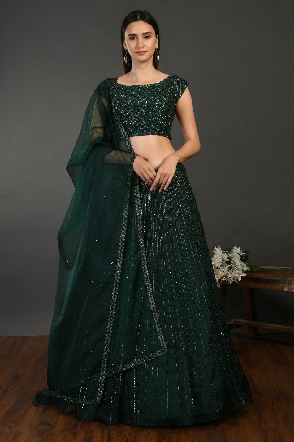 Beautiful bottle green embroidered designer lehenga with dupatta is perfect pick for festive and wedding occasions! Shop online from Pure Elegance.