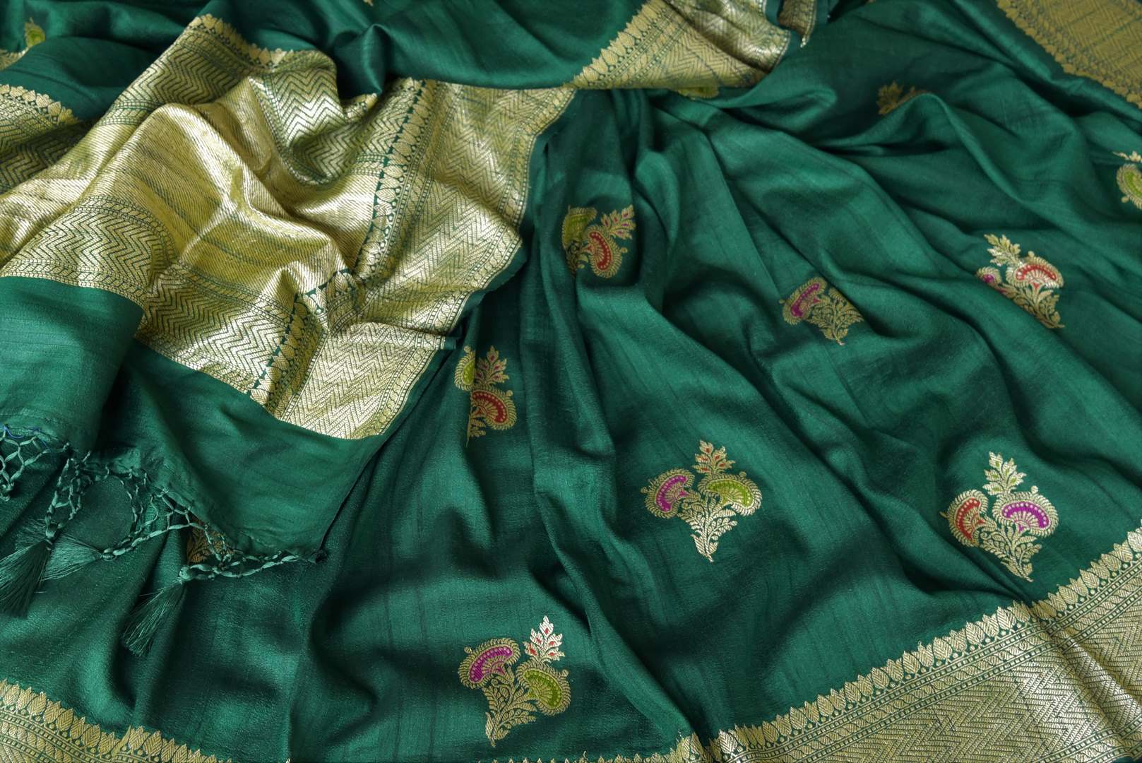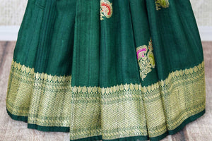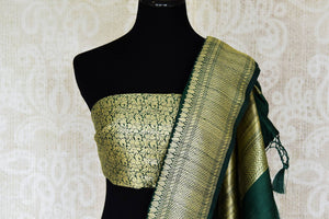 Ravishing bottle green khaddi Benarasi saree for weddings and festive occasions! The saree is crafted with zari and minakari floral buta and a zari border and pallu. It comes with a matching blouse piece. Buy online from Pure Elegance or visit our store in USA.
