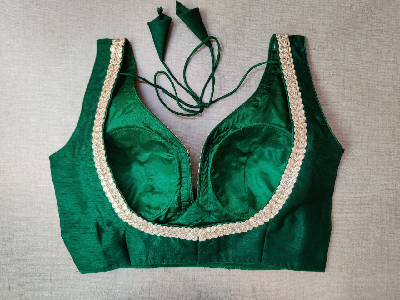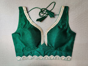 Beautiful bottle green sleeveless saree blouse with silver embroidery lace. Buy designer blouse in USA from Pure Elegance.