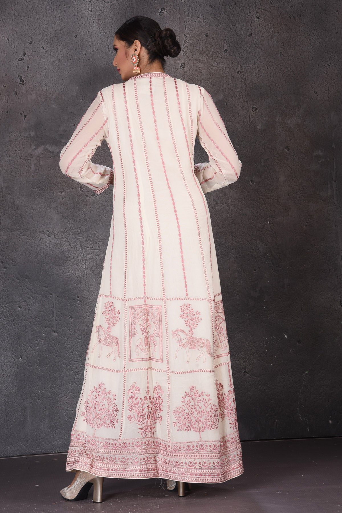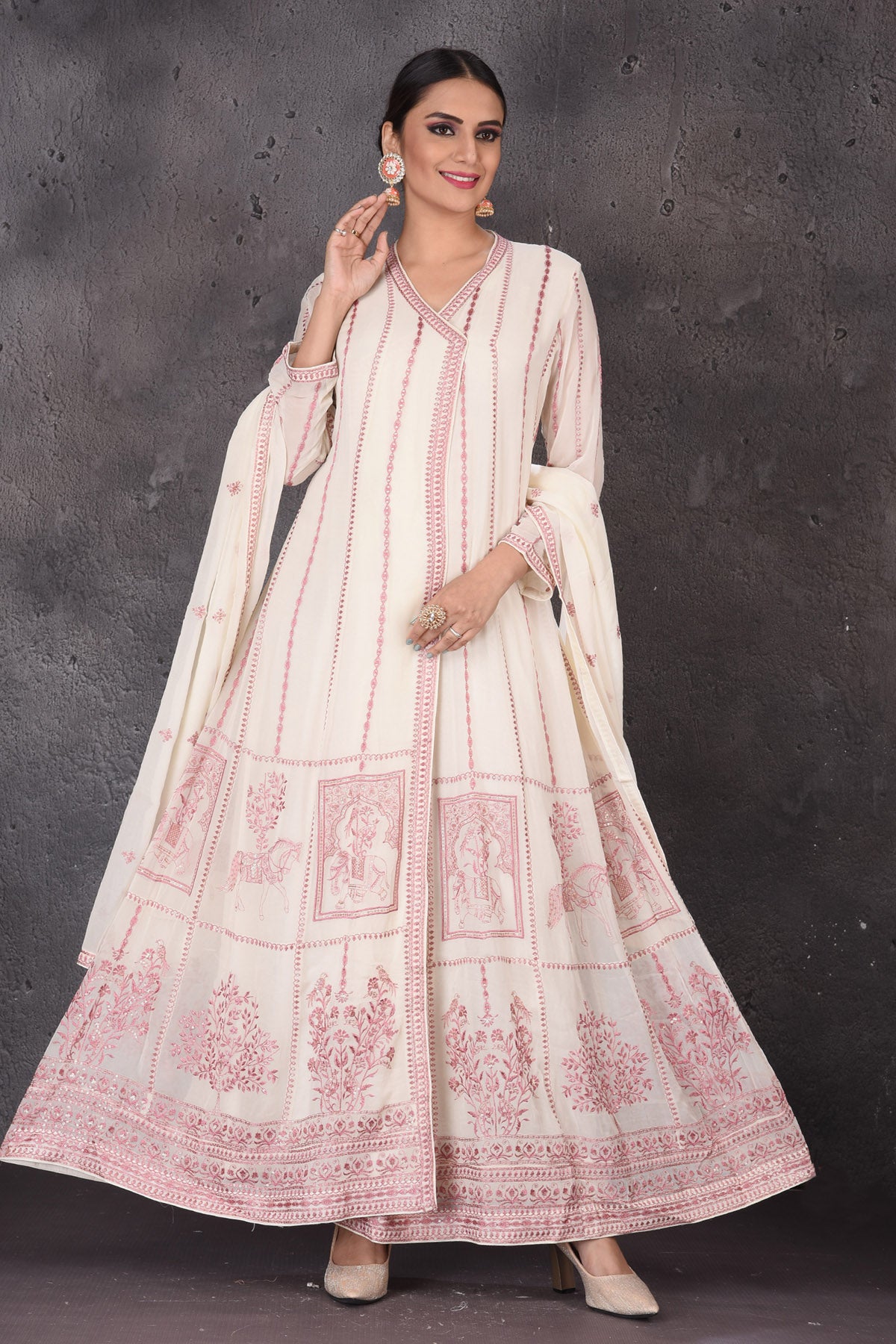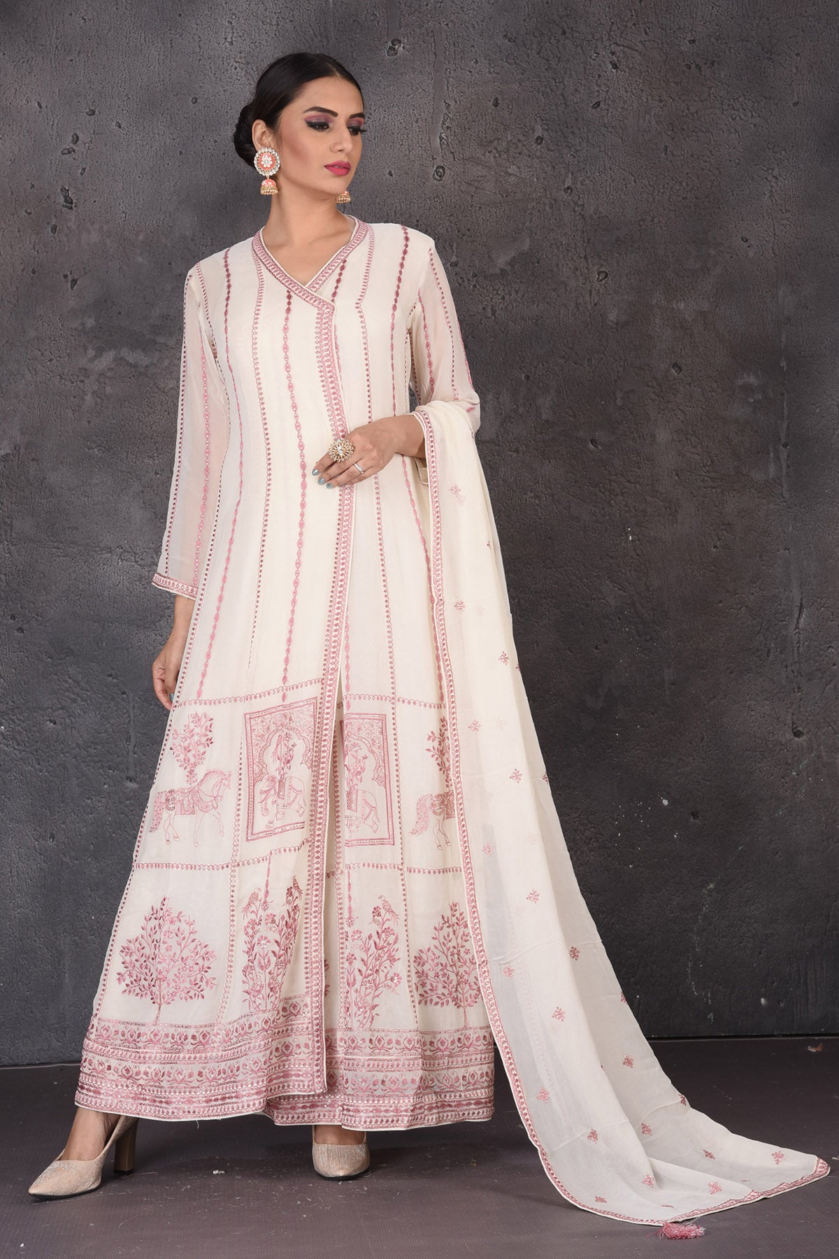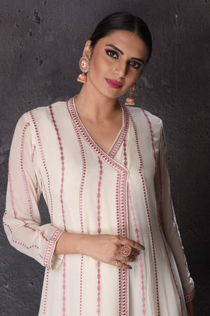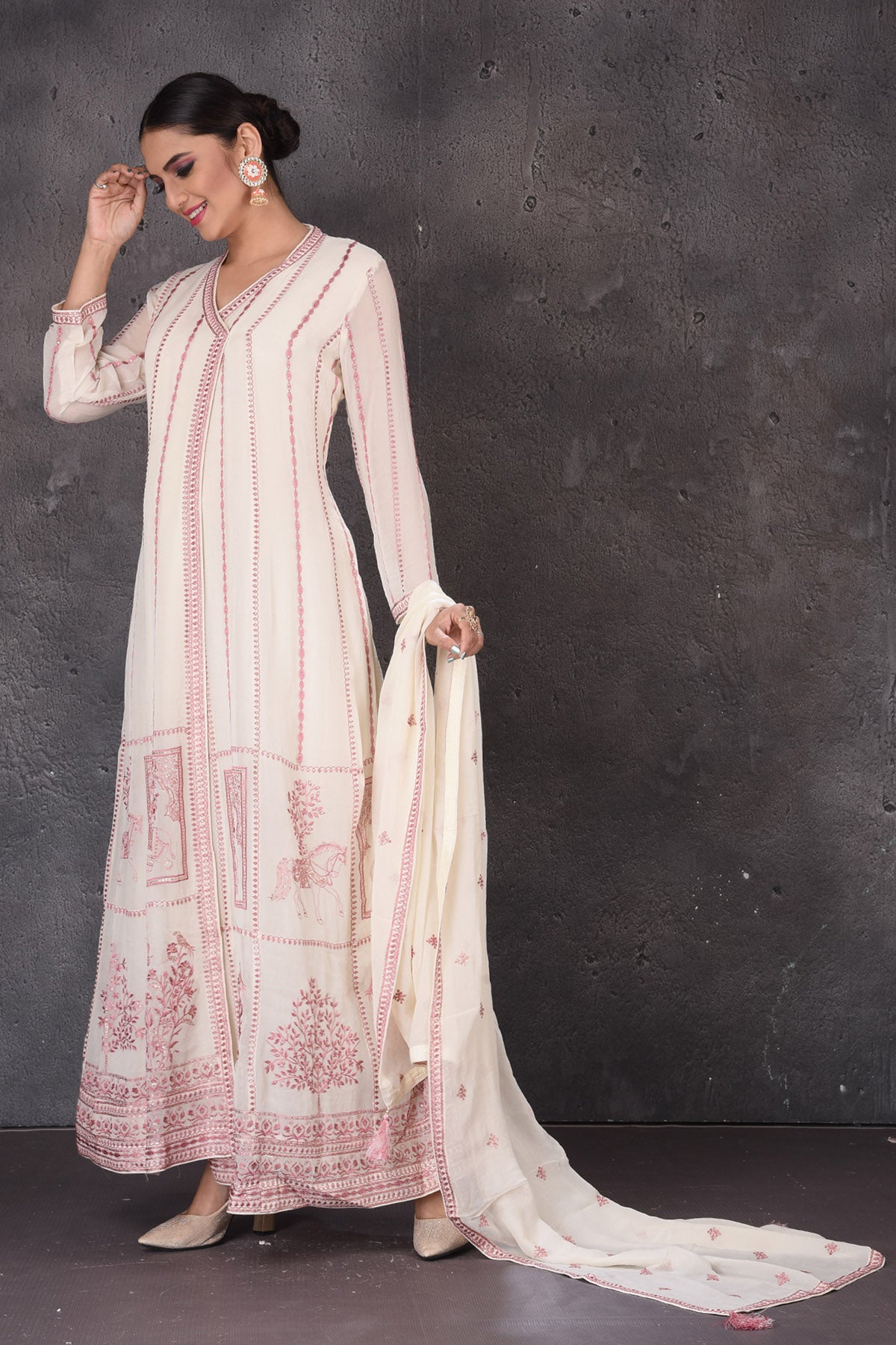 Look elegant at weddings and festive occasions in this bespoke cream embroidered floorlength suit. The suit comes with a matching dupatta. Shop designer suits in USA from Pure Elegance.