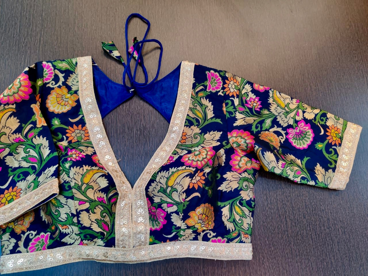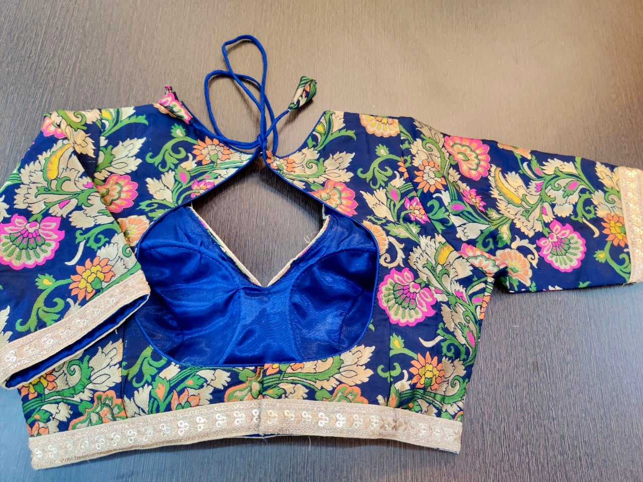 Attractive dark blue floral design saree blouse with embroidered lace. Buy online from Pure Elegance