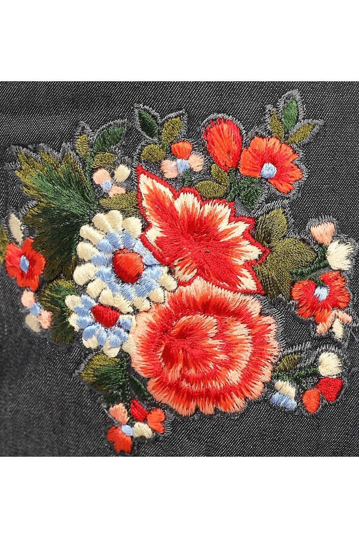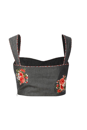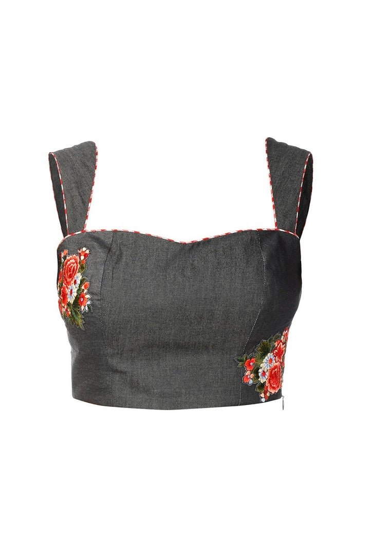 Stylish dark blue color floral print strappy denim saree blouse with red checks. Shop online at Pure Elegance or visit our store in USA!