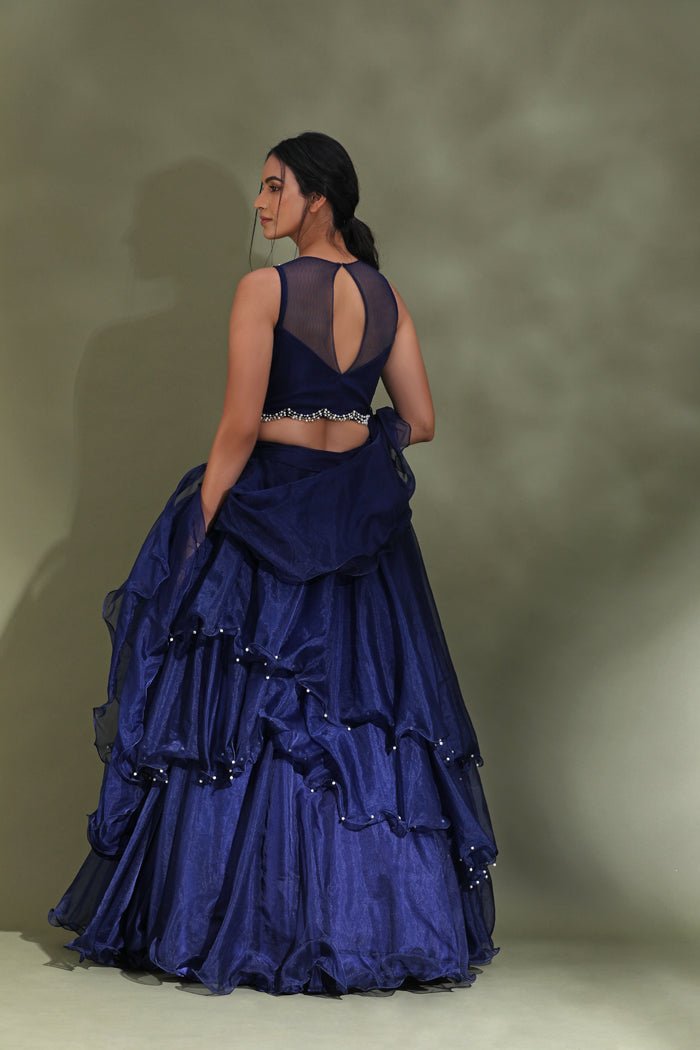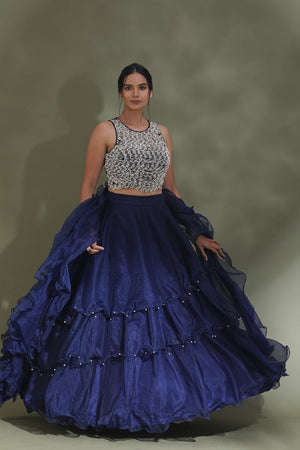 Dance the night away at sangeet and weddings in this contemporary dark blue ruffle lehenga with embellished blouse. It comes with a matching dupatta. Shop designer lehengas in USA from Pure Elegance.