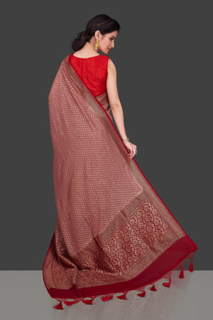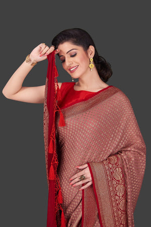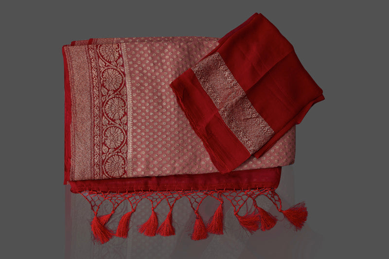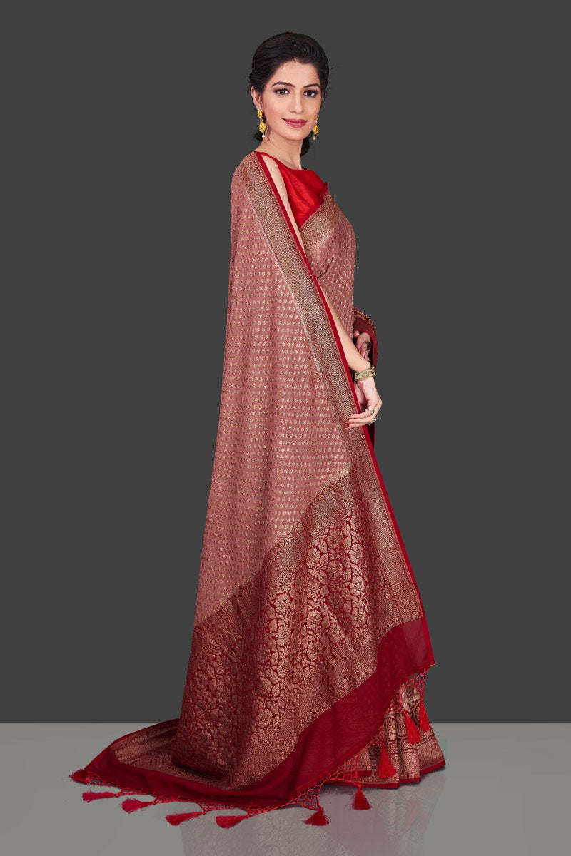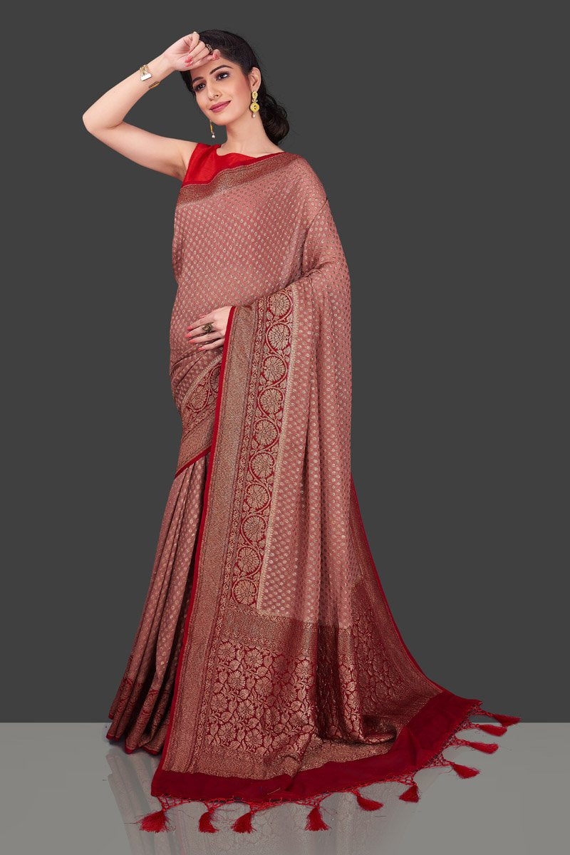 Charming dusty pink georgette Banarasi saree for festive occasions. The saree has a contrasting red antique zari border and pallu and is adorned with overall zari buta. Shop online from Pure Elegance.