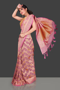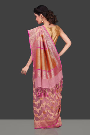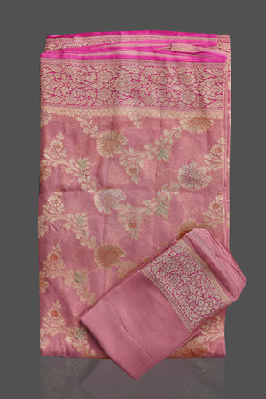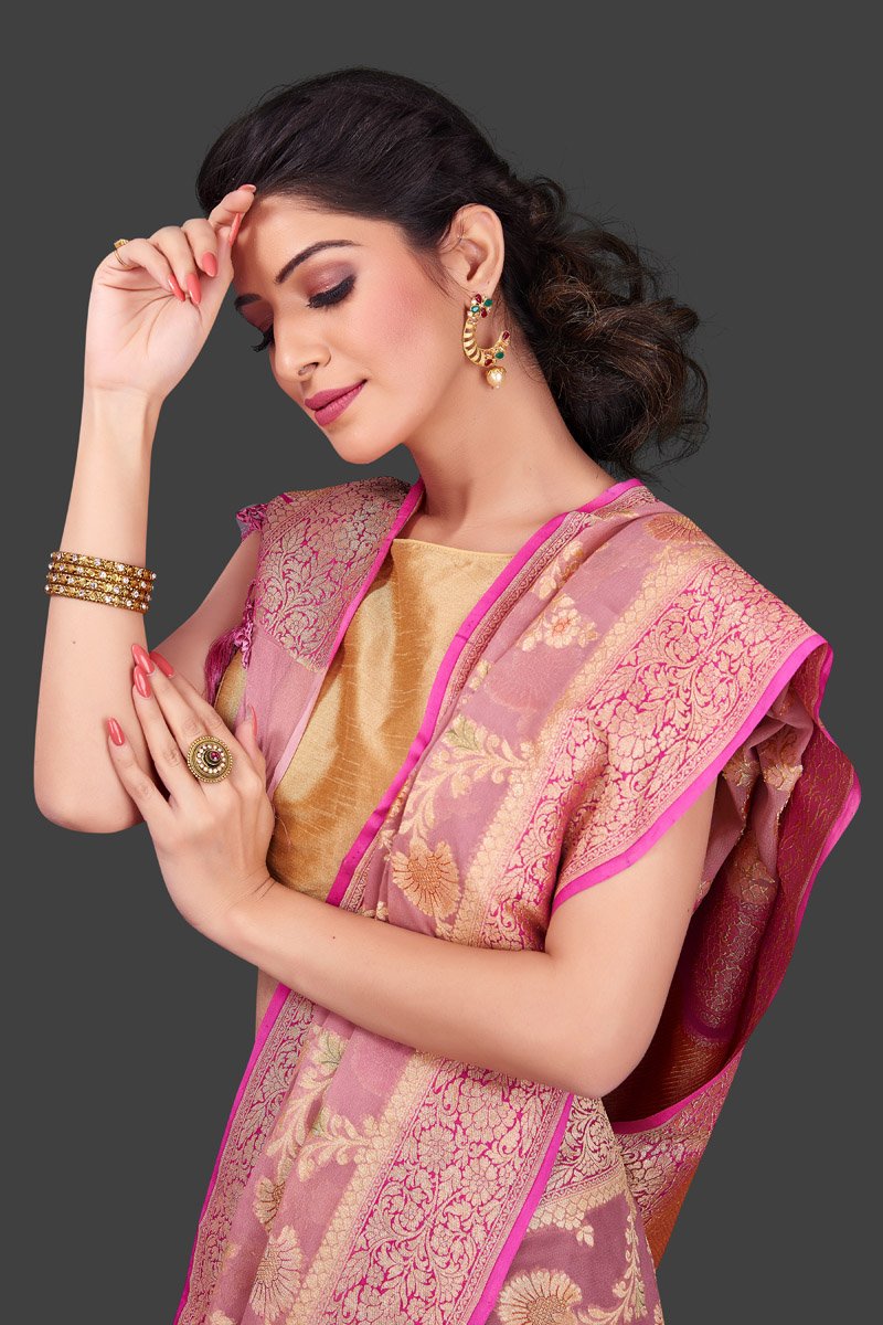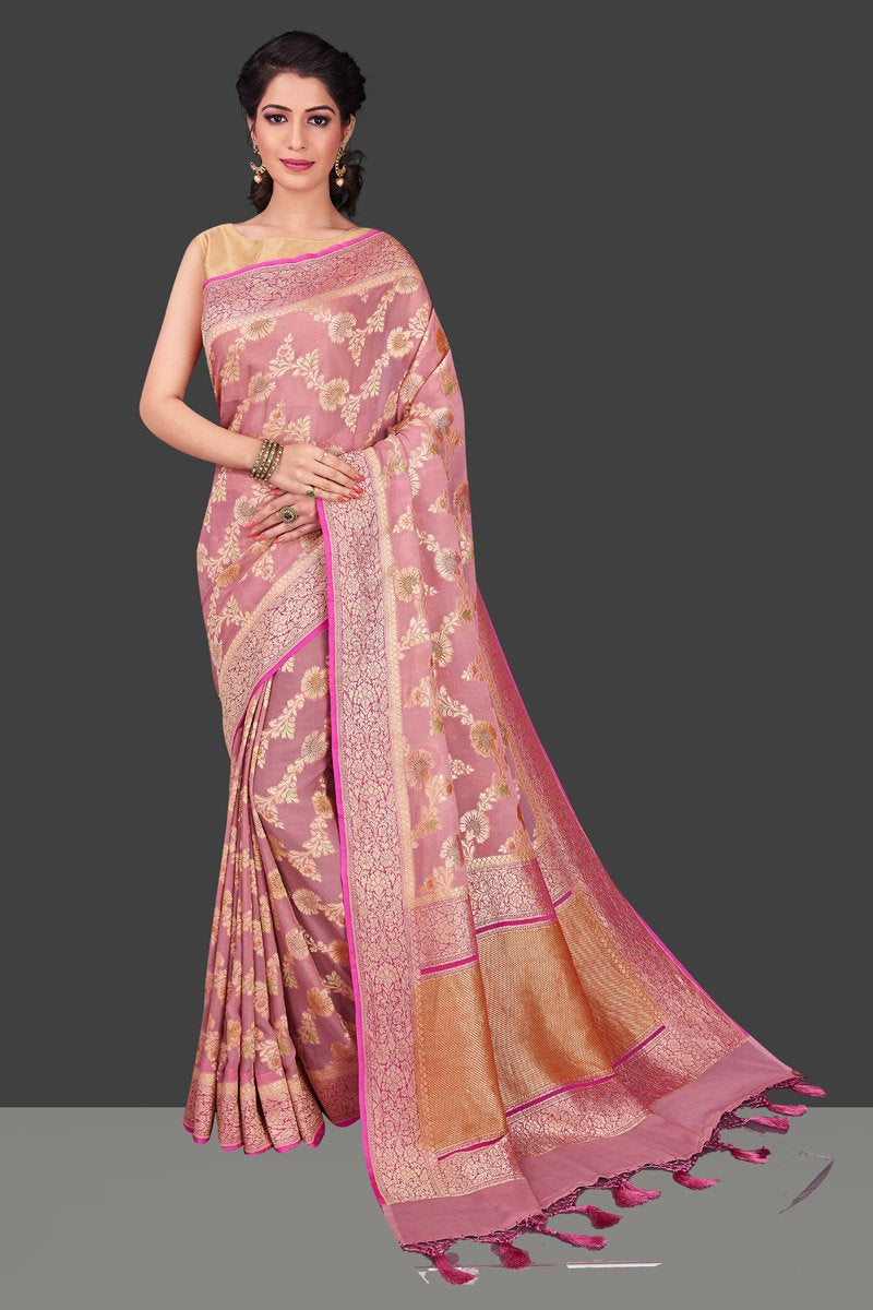 Lovely dusty pink georgette Benarasi saree for festive occasions. The saree is enhanced with overall floral zari jaal and has an orange zari pallu. It comes with a matching blouse piece. Buy online from Pure elegance.