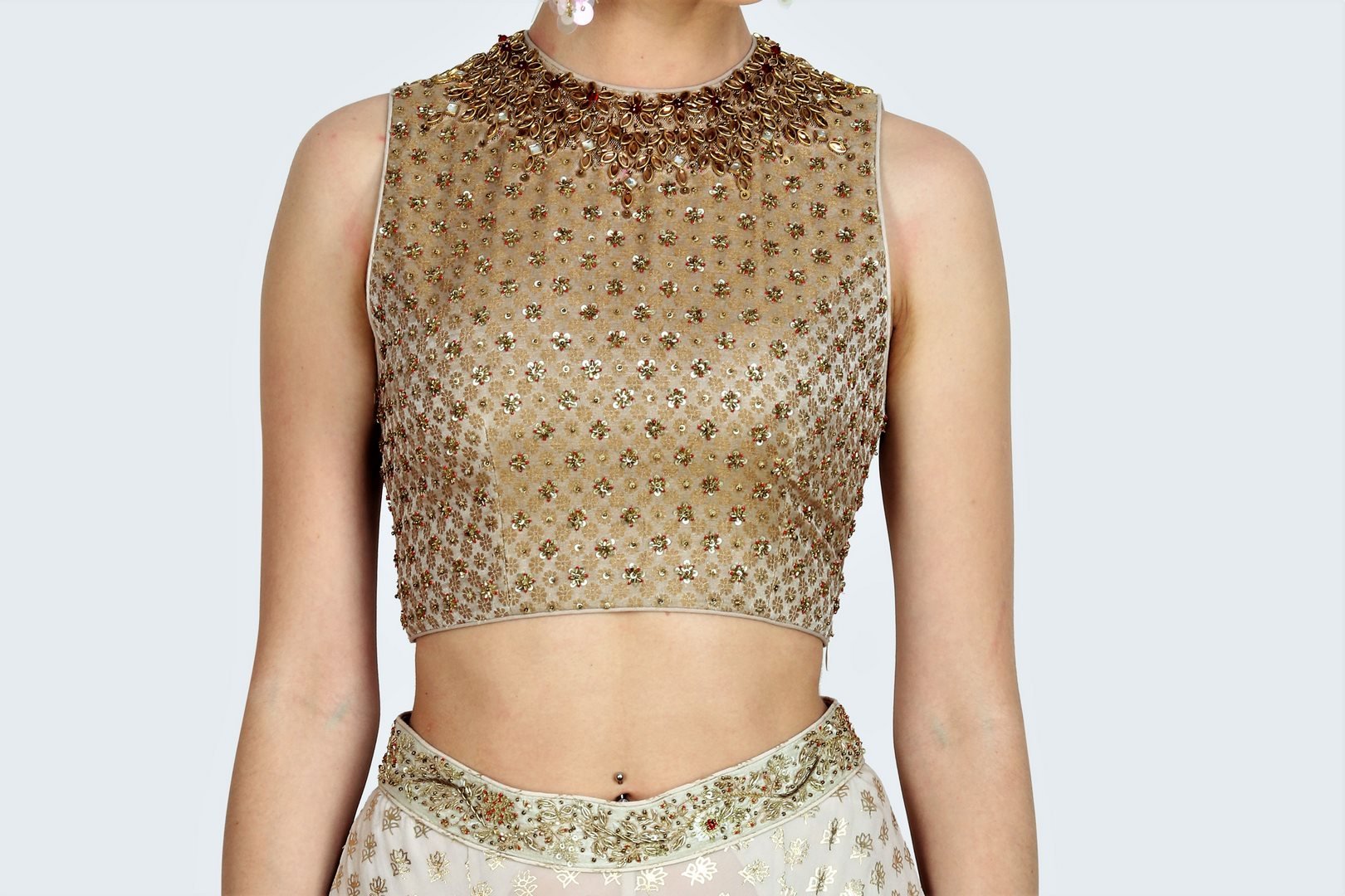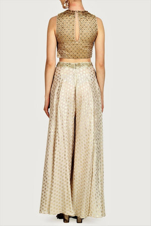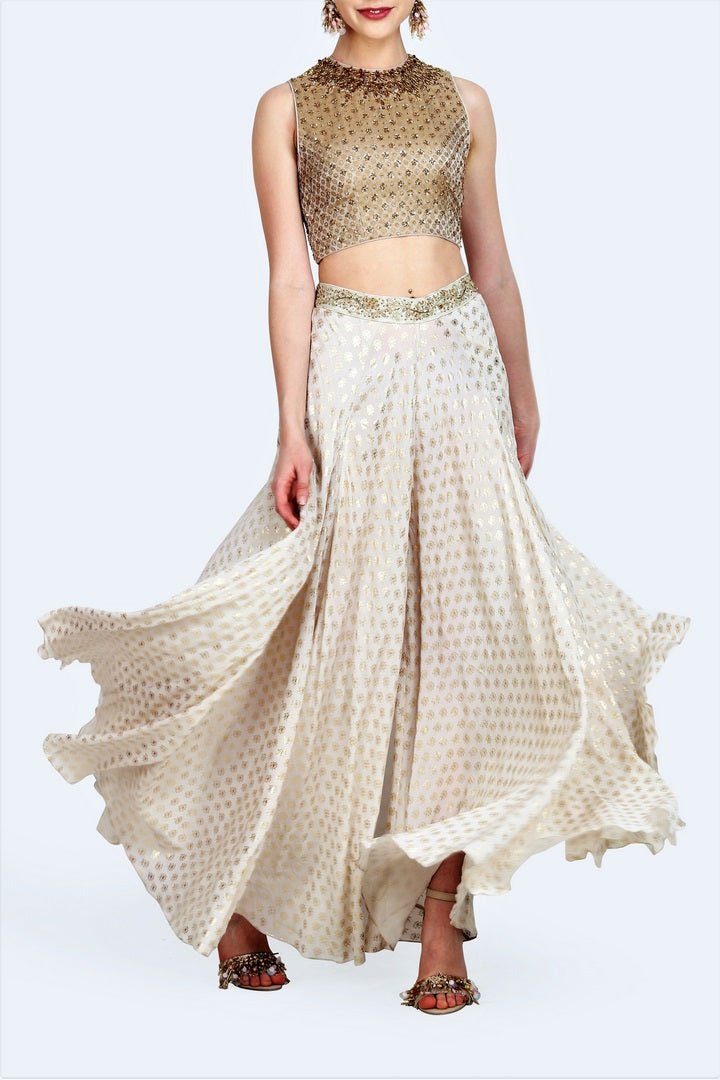 Enhance your Indowestern style with this gold brocade embroidered crop top with foil stamp wide leg sharara. The top is adorned with chita work and kundan embroidery on the neckline. Shop online at Pure Elegance or visit our store in USA!