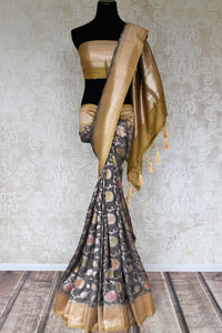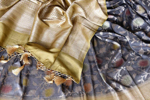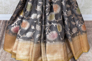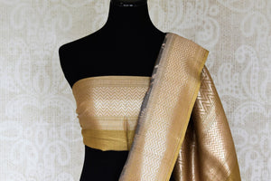 Handwoven grey khaddi Benarasi saree for tasteful sartorial style at weddings and festive occasions! The saree is crafted with zari and minakari floral jaal and a zari border and pallu. It comes with a matching blouse piece. Buy online from Pure Elegance or visit our store in USA.