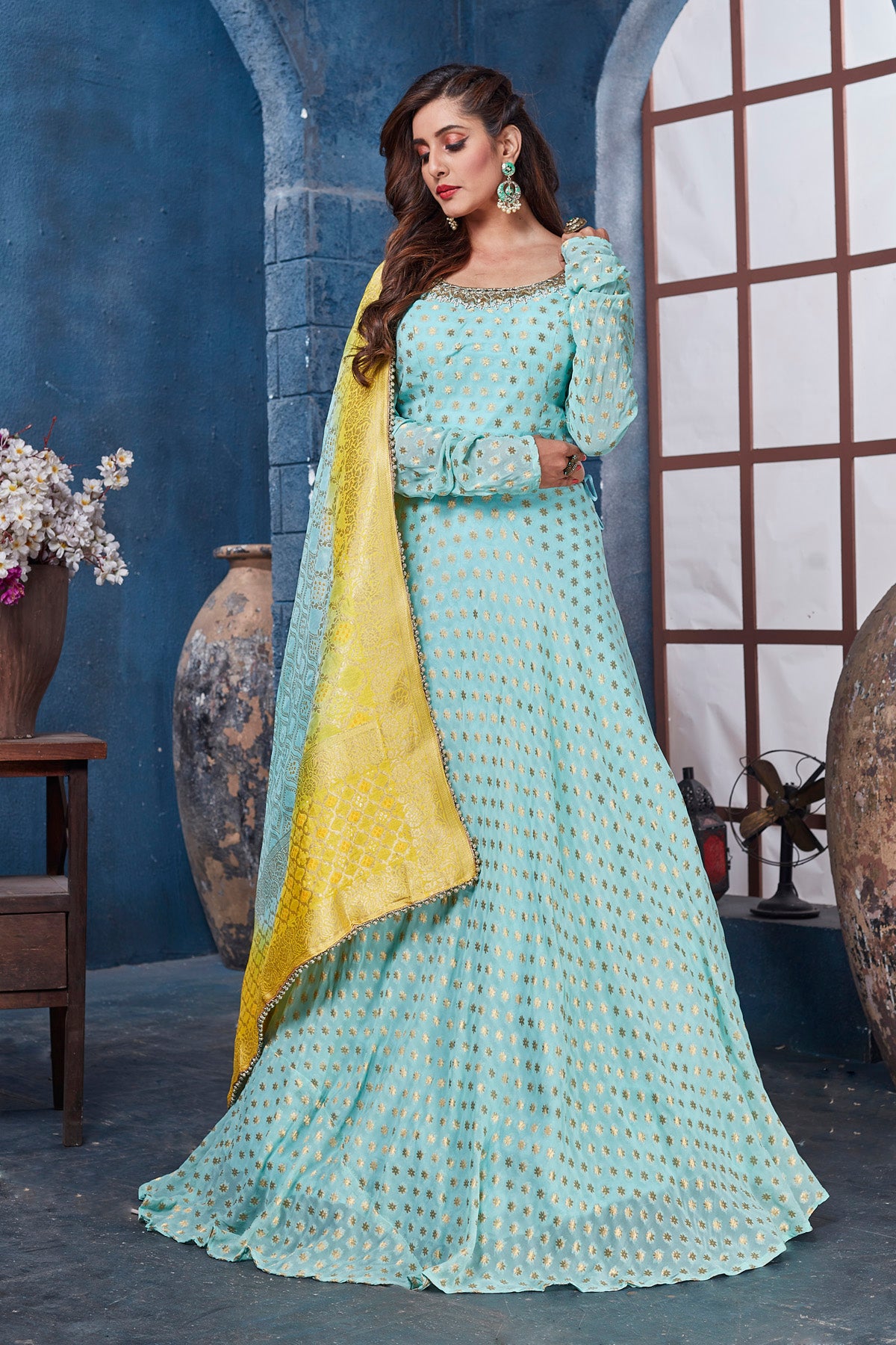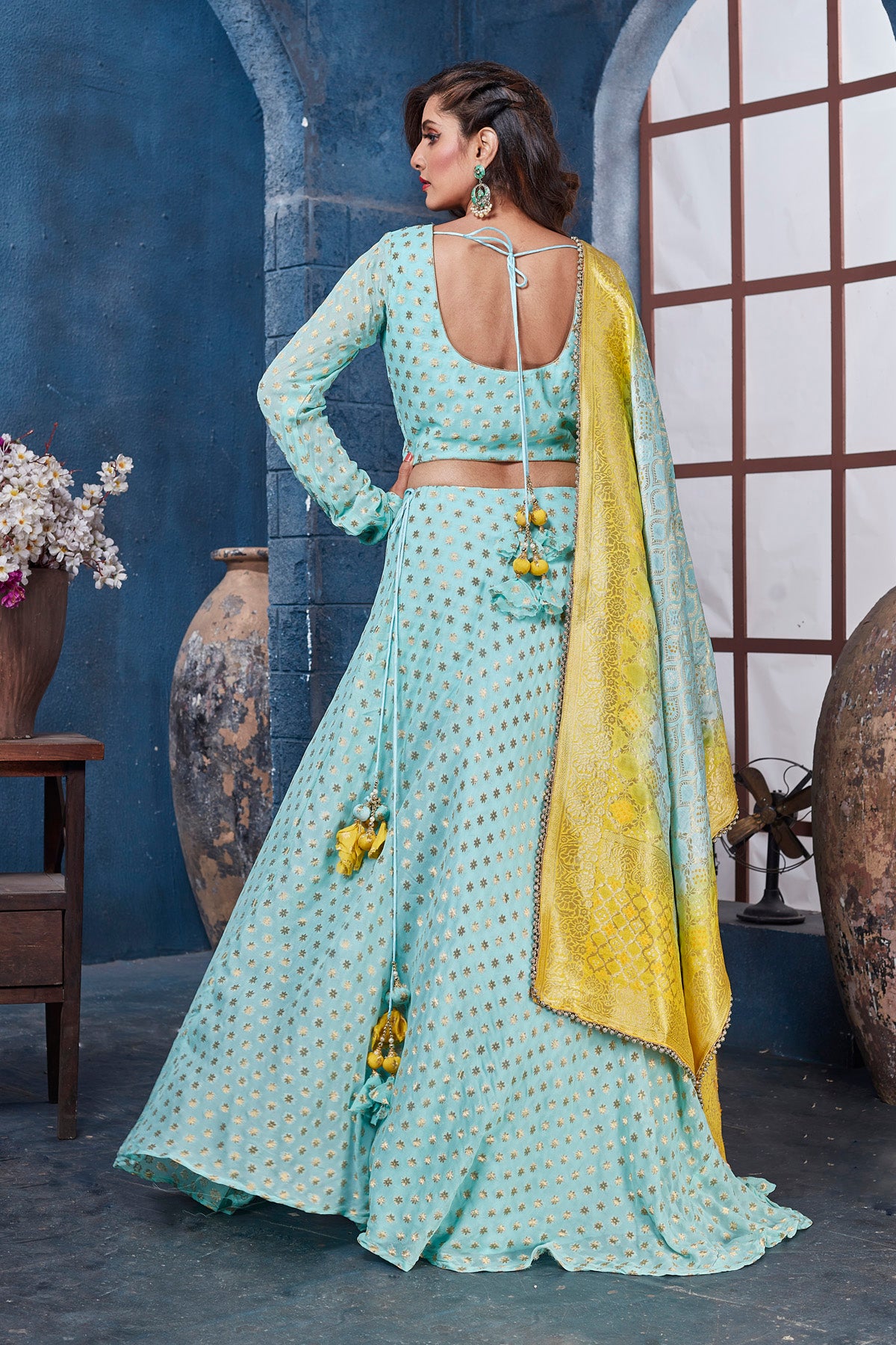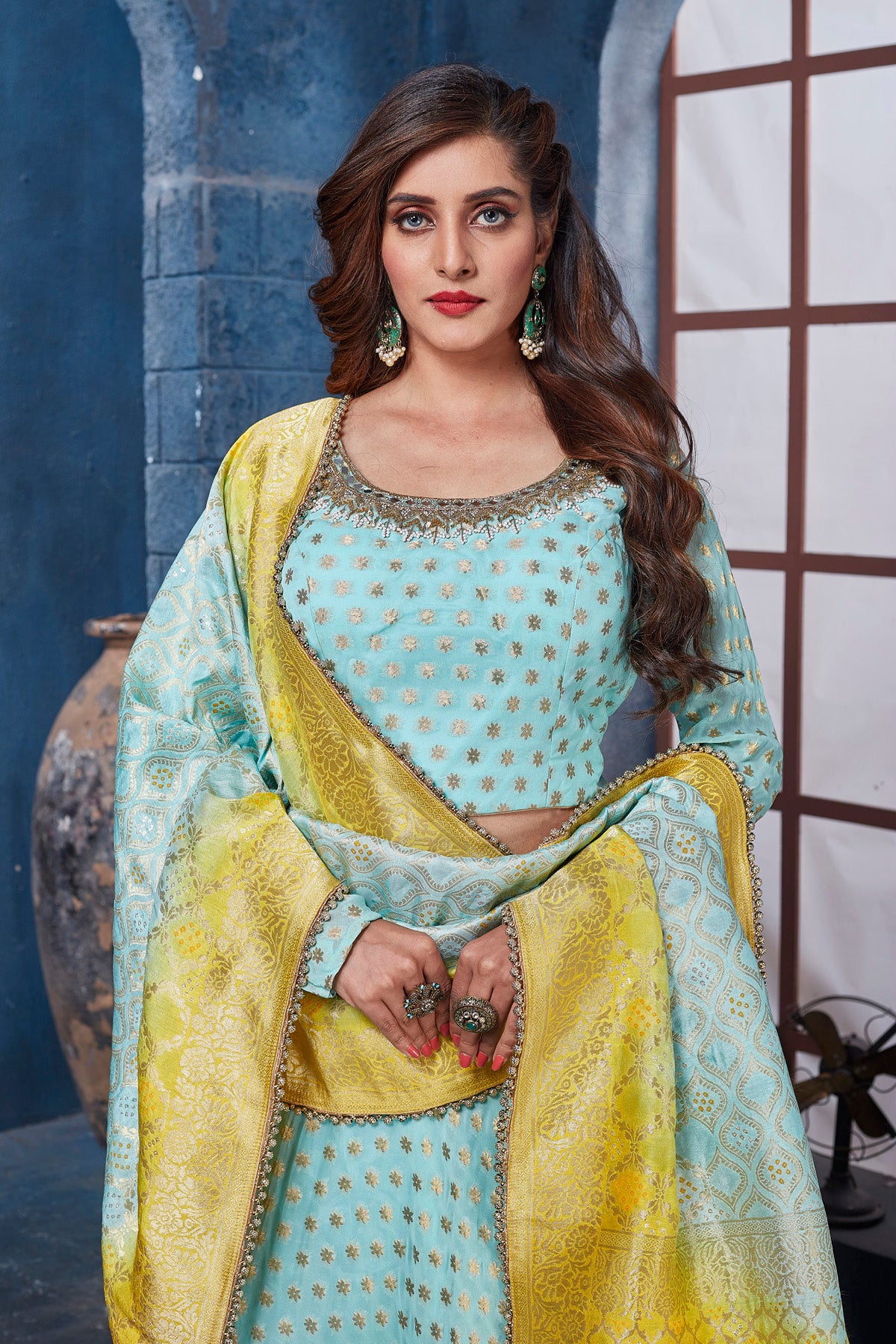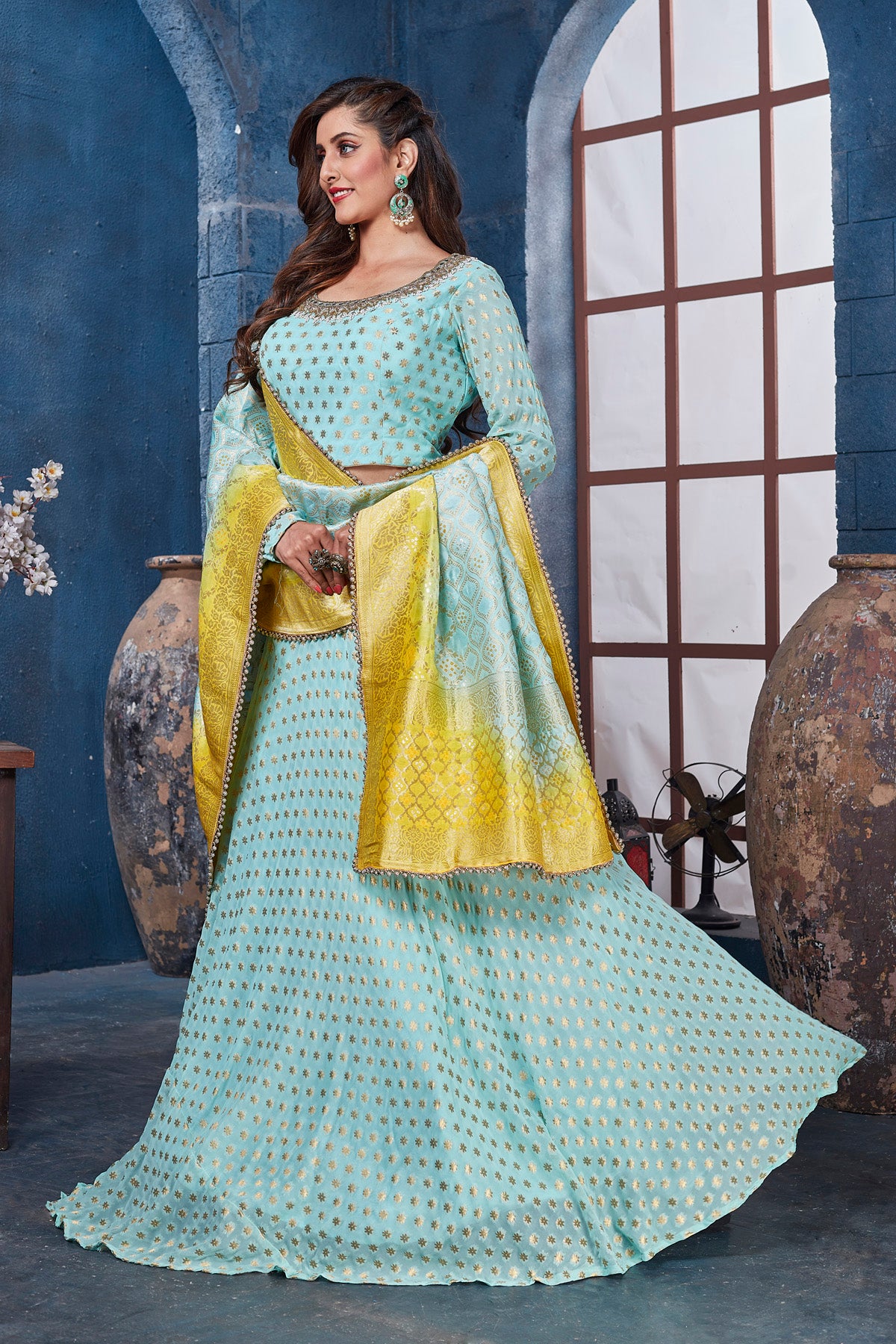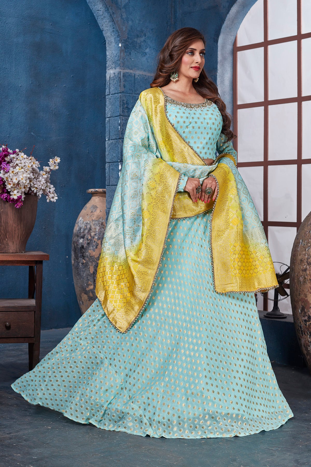 Get set to dazzle in this gorgeous light blue embroidered designer lehenga with yellow and blue dupatta. The lehenga is perfect ensemble for wedding occasions and parties.