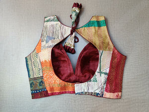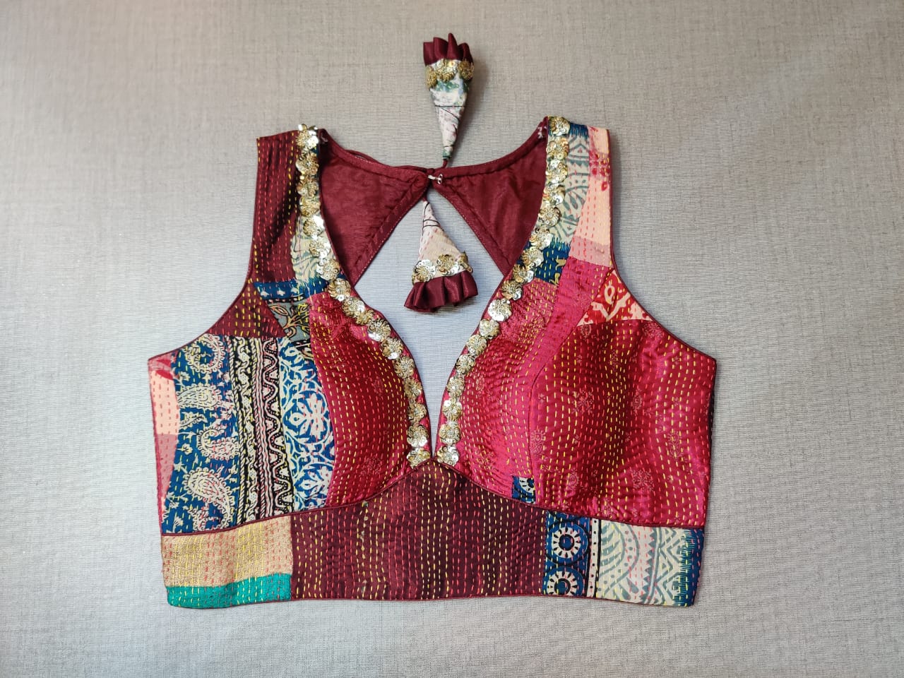 Pair your sarees with this beautiful maroon multicolor patch designer saree blouse for a perfect ethnic look. The blouse is enhanced with Kantha stitch and sequin embroidery. Buy designer blouse in USA from Pure Elegance..