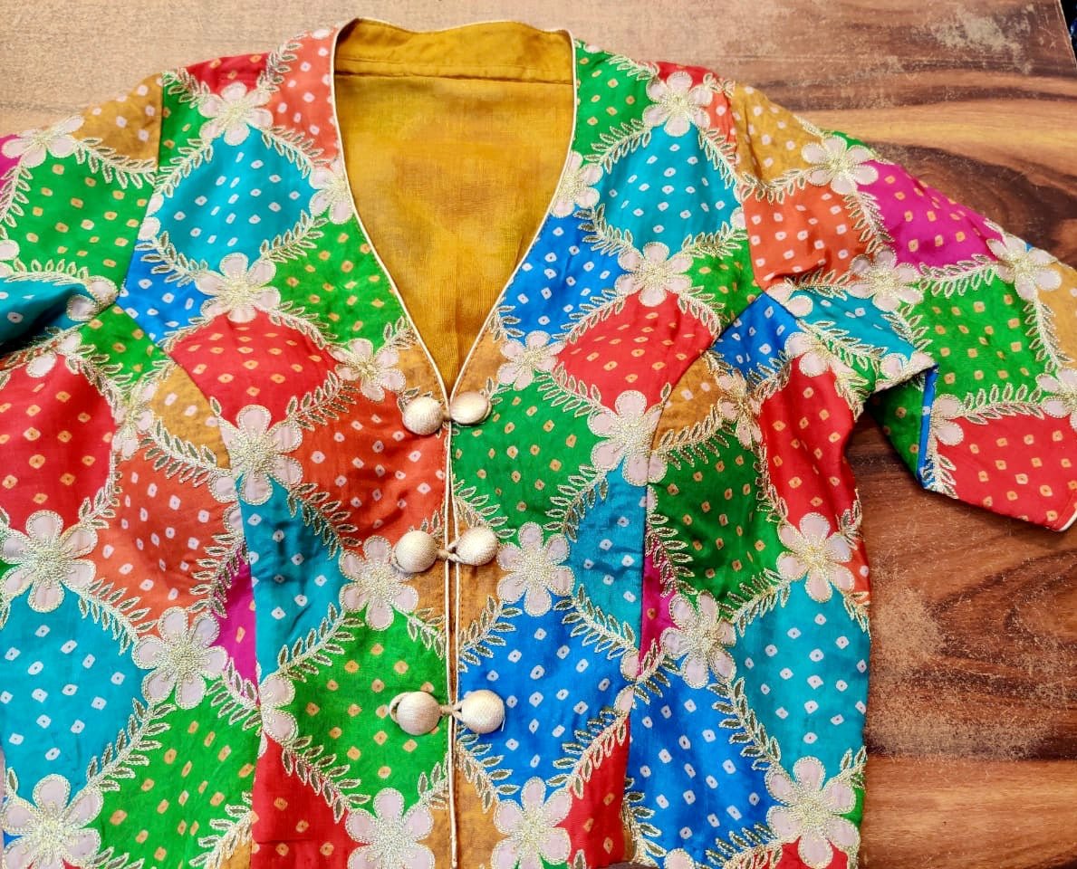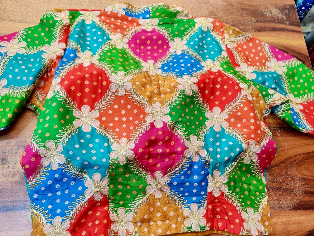 Beautiful multicolor Bandhej silk embroidered designer sari blouse. Buy online from Pure Elegance