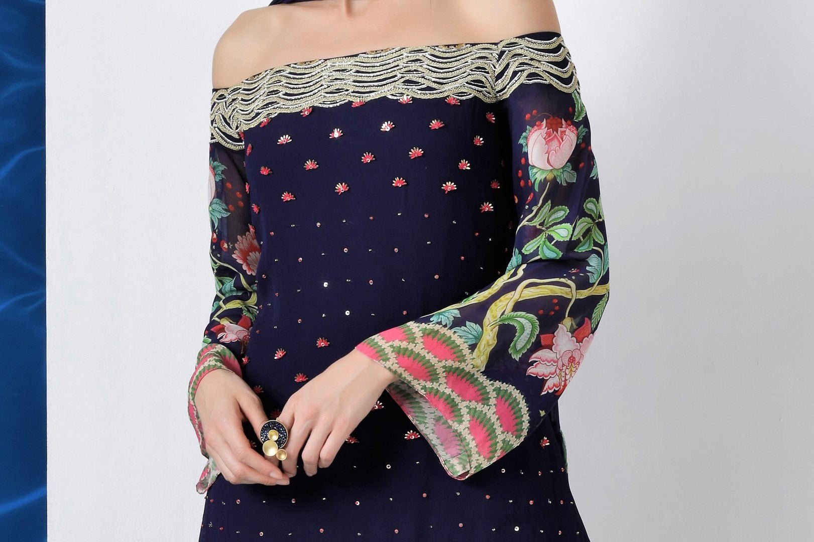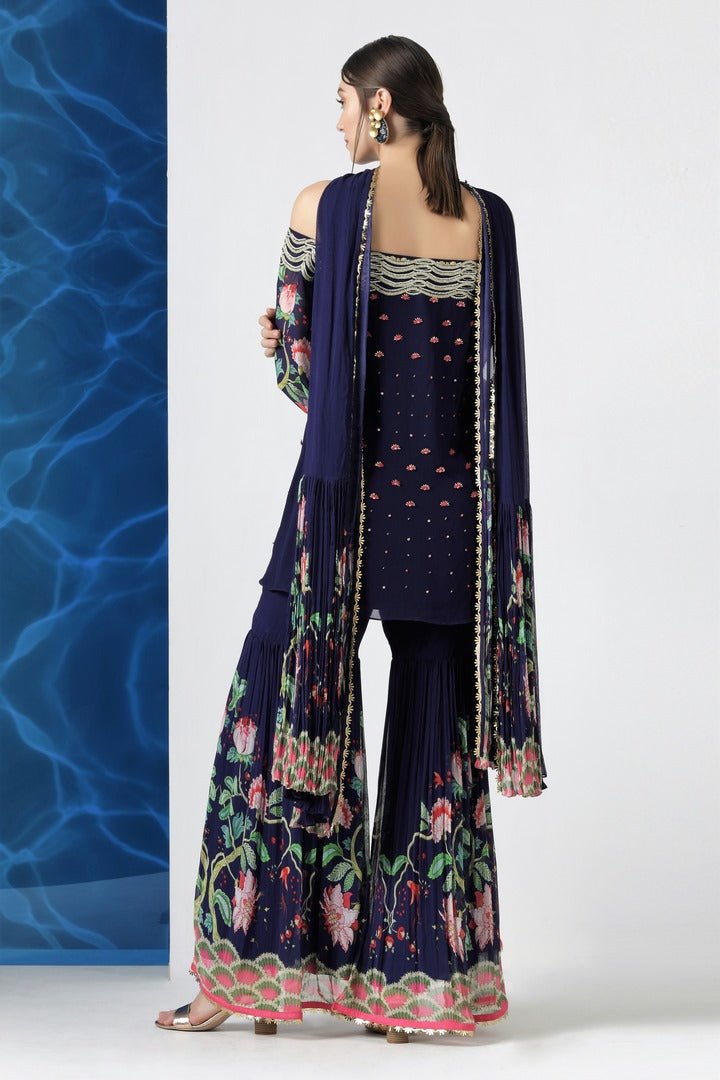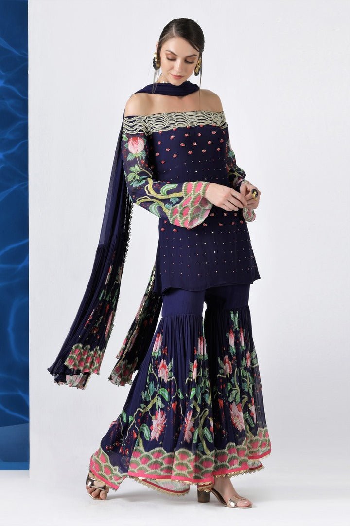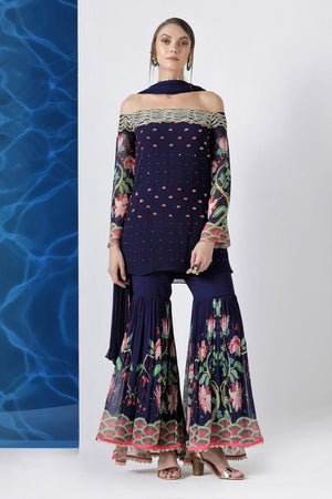 Modern yet ethnic navy embroidered off-shoulder kurti with printed sharara and dupatta by Abirr n Nanki is perfect for festive occasions. The ensemble is crafted in georgette and crepe. Shop online at Pure Elegance or visit our store in USA!