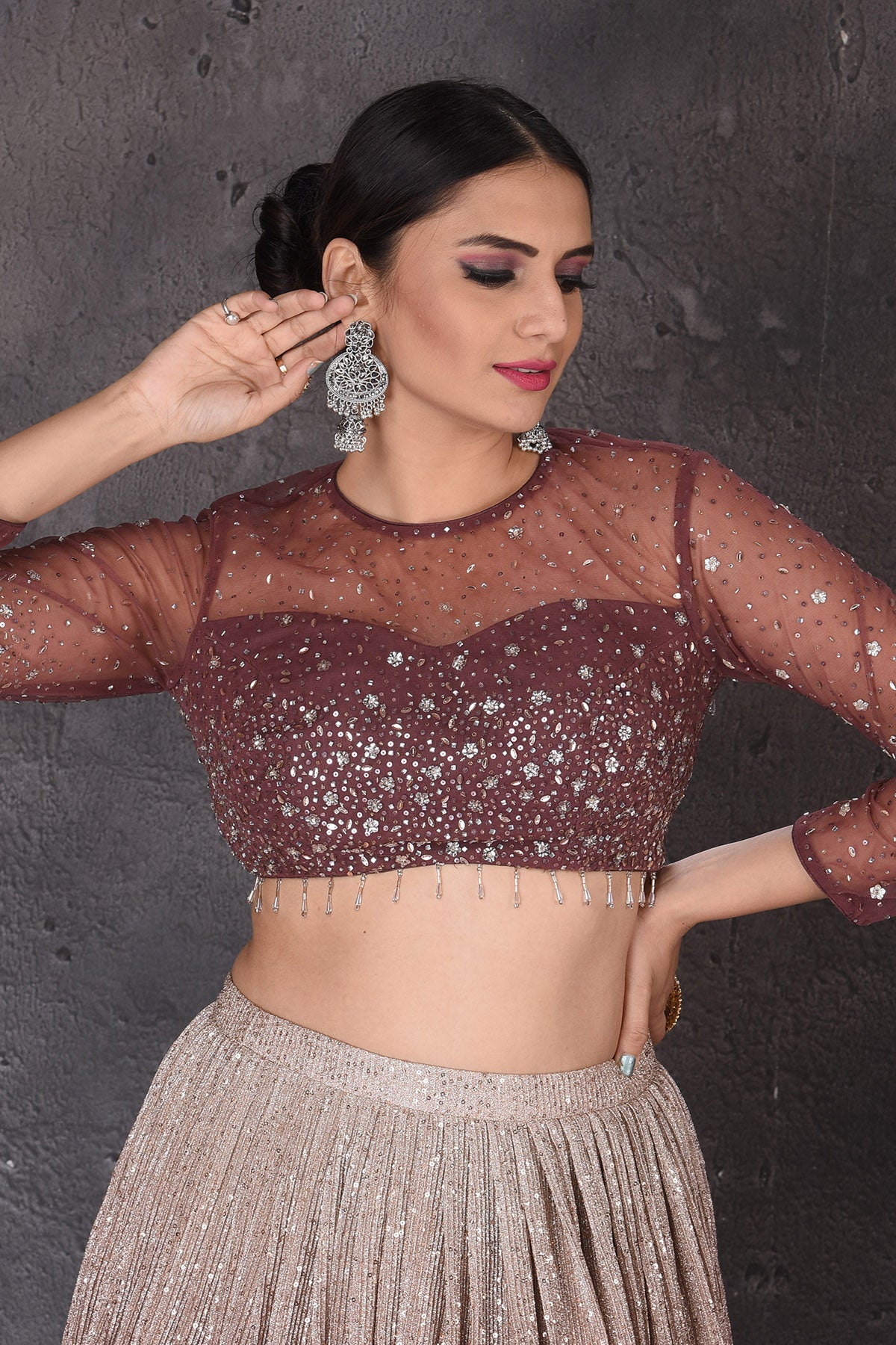 Set a fashion statement at parties and festive occasions in this beautiful grey and beige sequin work designer lehenga with dupatta. Shop designer dresses in USA from Pure Elegance.