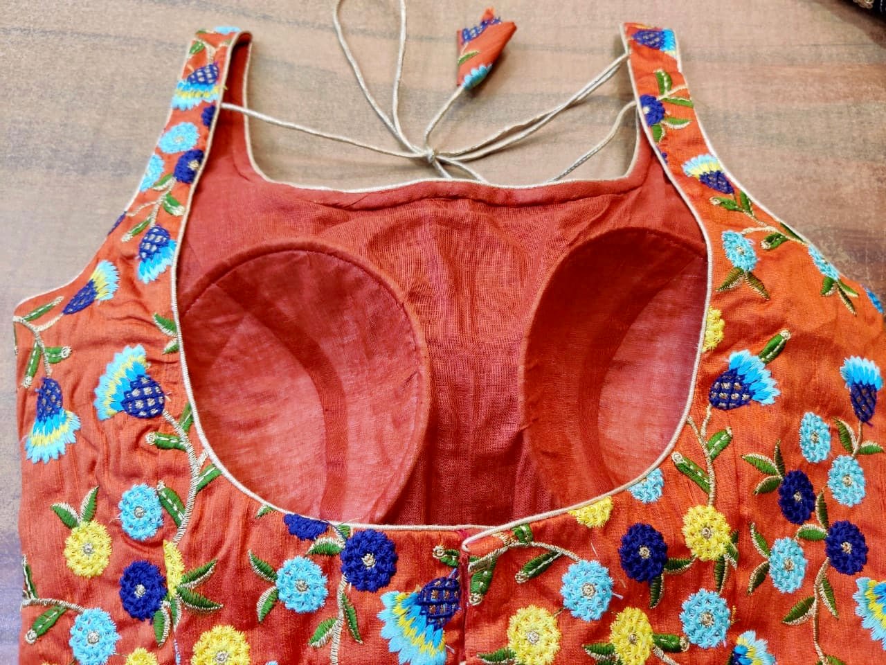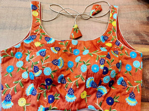 Gorgeous orange designer sleeveless saree blouse with blue embroidered flowers. Buy online from Pure Elegance