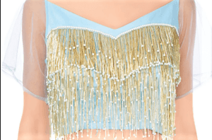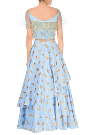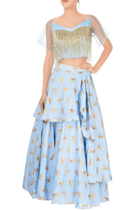 Twirl like a princess in this pastel blue bird woven layered cotton lehenga! It is paired with a sweet heartneckk crop top with glass pipe & pearl tassels. Shop online at Pure Elegance or visit our store in USA.