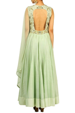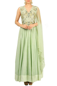 Go for soft yet striking ethnic look in this green chanderi silk Anarkali suit by Neha Khullar on festive occasions. The suit has a V neckline and cut-out back design and the highlight is the draped sheer single sleeve. It is crafted in chanderi silk with zari, cut tube, and sequin detailing. Shop online at Pure Elegance or visit our store in USA!
