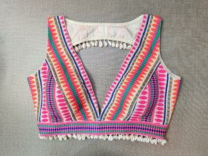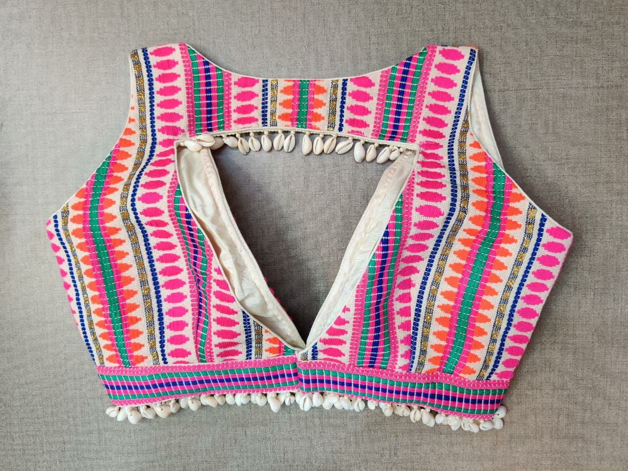 Contemporary pink and orange threadwork sari blouse with shell tassels. Buy designer blouse in USA from Pure Elegance.