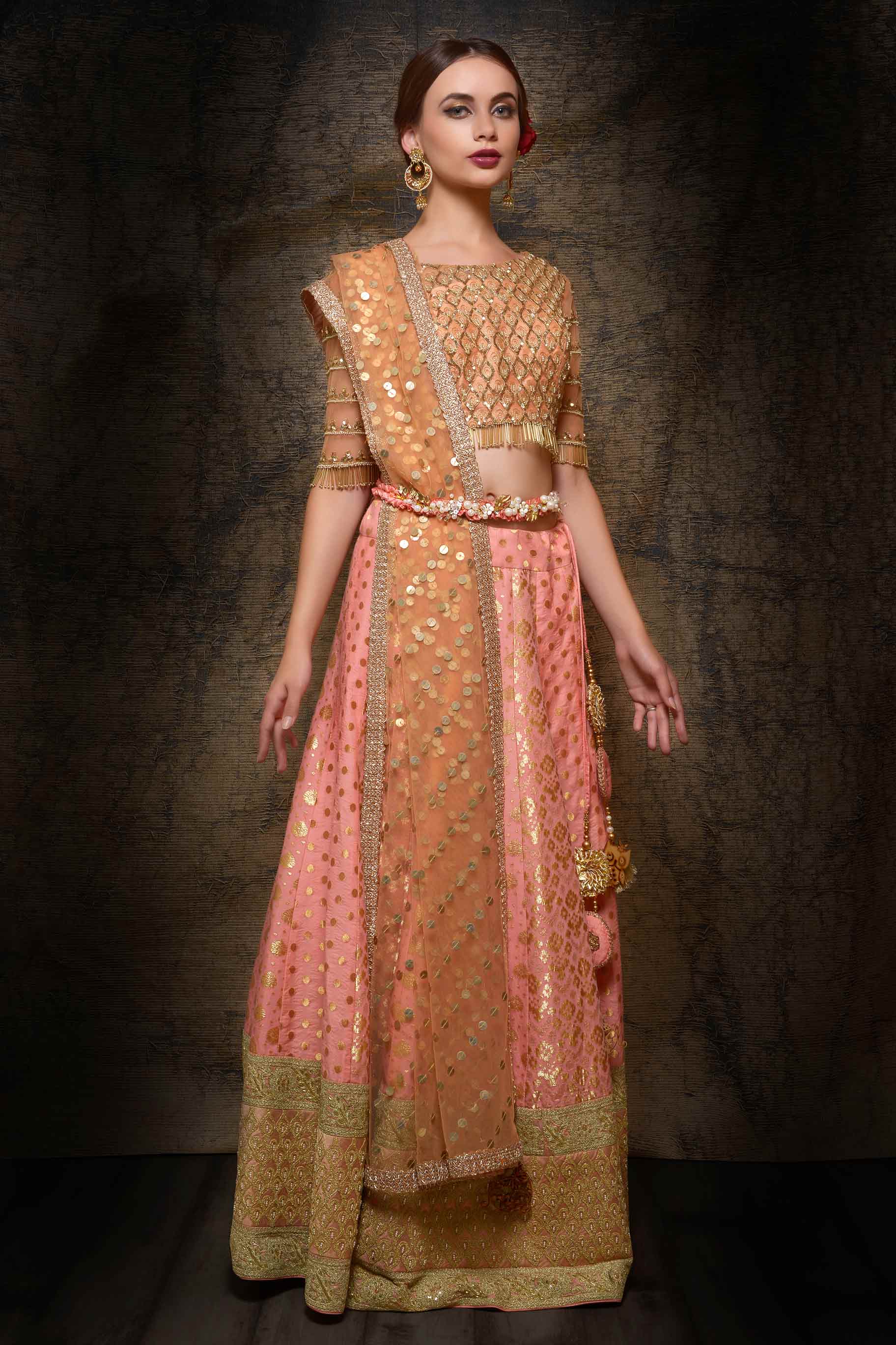 Radiate elegance in soft pink embroidered lehenga choli with dupatta at weddings and special occasions! The lehenga is adorned with dull and bright dori work while blouse is crafted with sequins and pipe tassels. It comes with a matching peach net dupatta with sequins and nakshi border. Shop online at Pure Elegance or visit our store in USA!