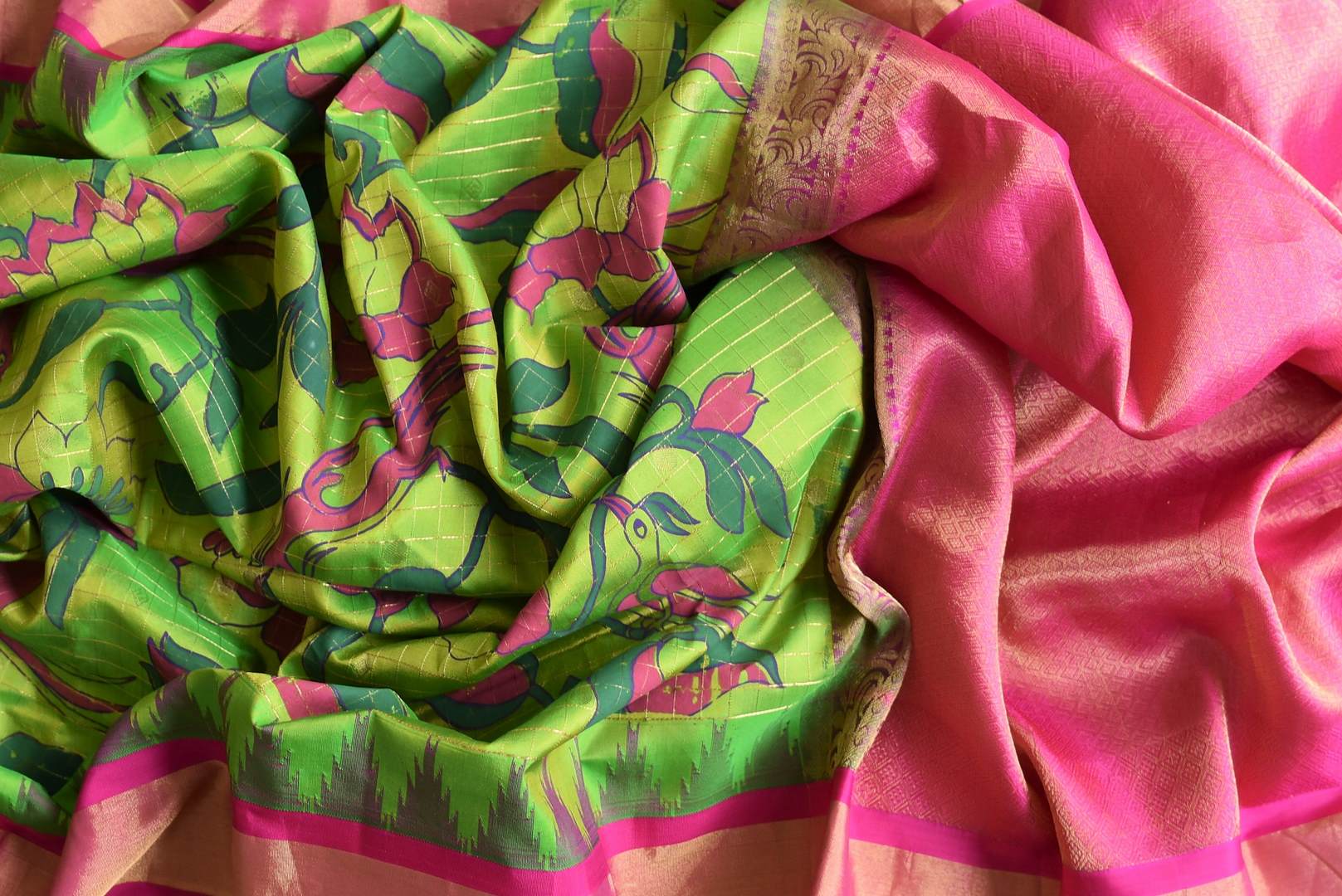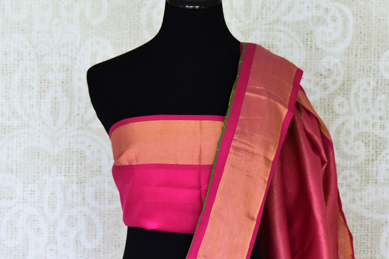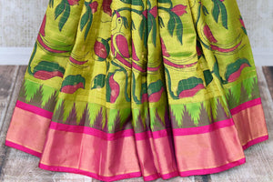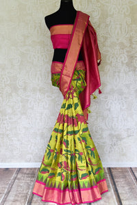 Stunning pista green floral print Gadhwal silk saree with pink zari border is a perfect drape for festive occasions. It comes with a matching blouse piece. Shop silk sarees in USA from Pure Elegance.