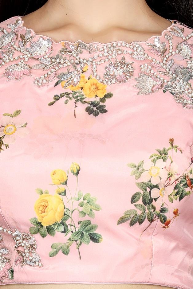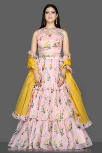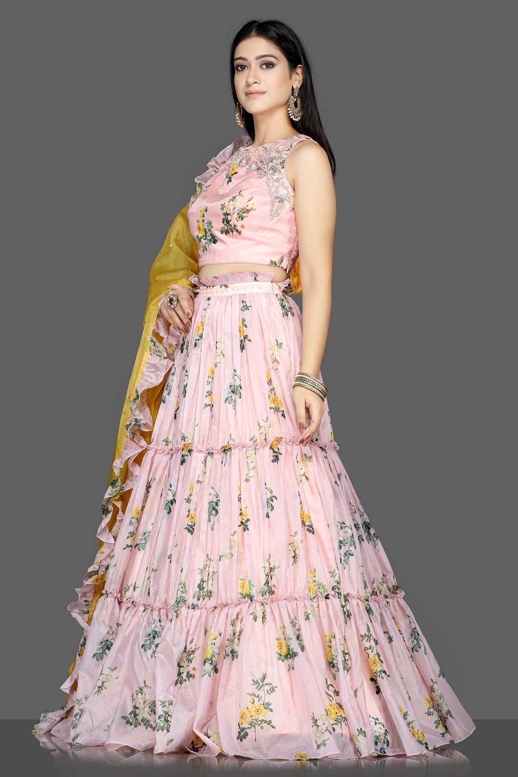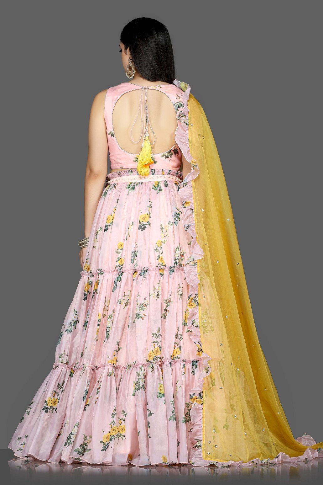 Stunning powder pink floral print embroidered organza silk lehenga for weddings. The lehenga comes with a contrasting yellow dupatta. Shop such designer lehengas online in USA from Pure Elegance